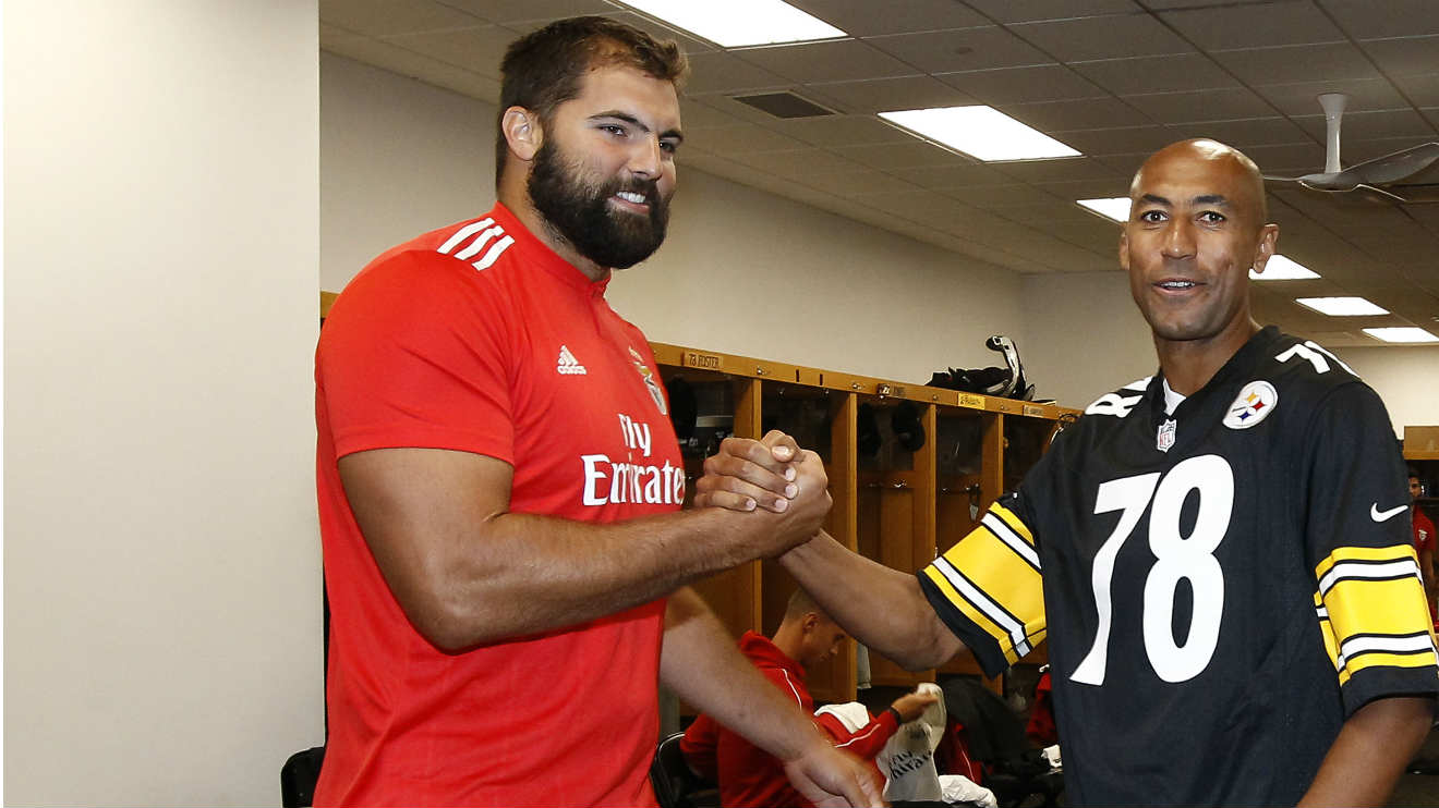 Alejandro Villanueva, a famous American football player, was at the Eagles' training session, swapped jerseys with Luisão and was delighted with everything.
