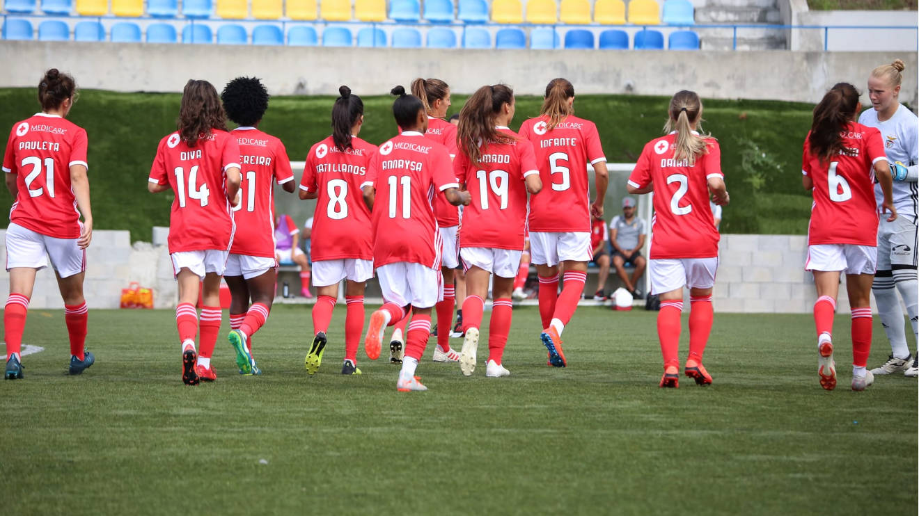Starting XI of Benfica: Dani Neuhaus; Daiane, Tayla, Tita, Yasmim; Pauleta, Andreia Faria, Evy Pereira; Darlene, Cloe and Nycole.