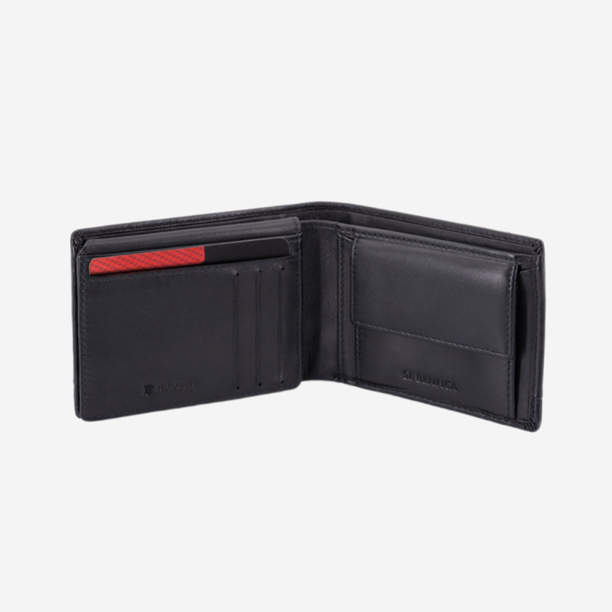 Small black wallet in genuine Sport Lisboa e Benfica leather. The inside of the wallet has compartments for cards, notes or small documents and a coin purse. There's also a detachab...
