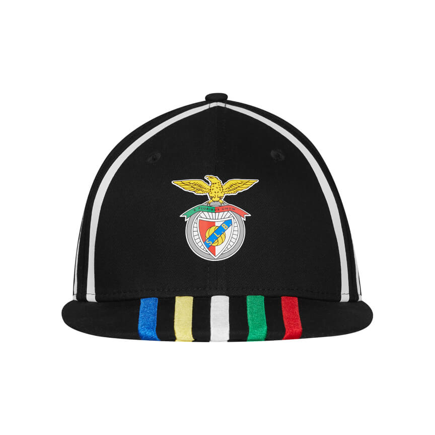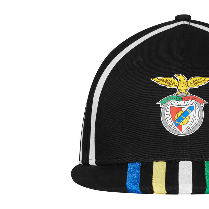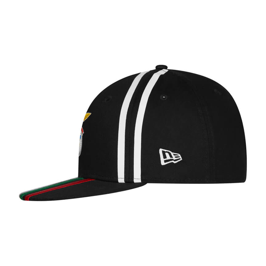 Gorra negra con el emblema del club y rayas alusivas a la 2º equipación utilizada por el equipo del Sport Lisboa e Benfica en la temporada 2023 2024. Modelo New Era 9Fifty Snapback con dos paneles traseros abiertos y sistema de ajuste tradicional.