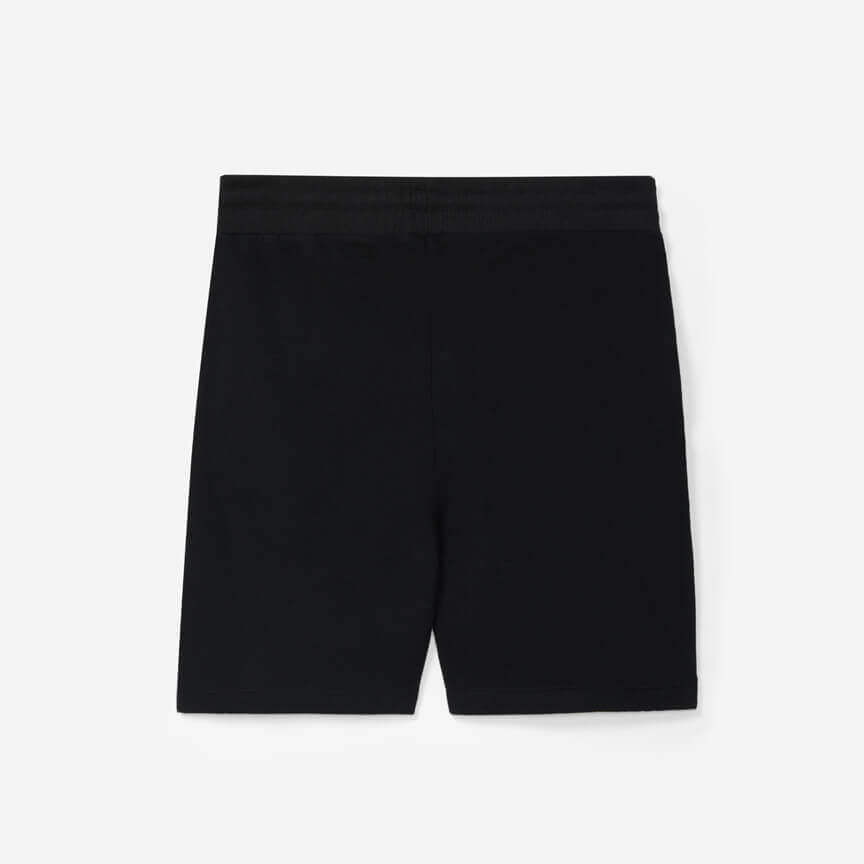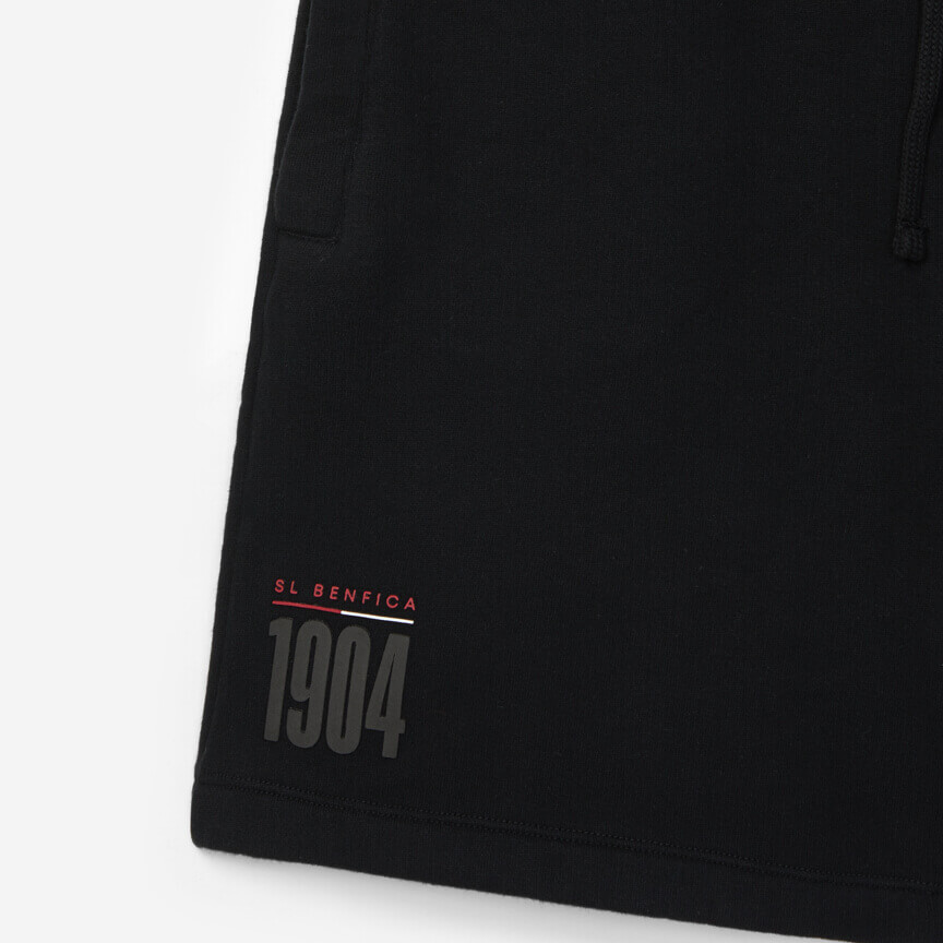 Shorts noir cardé avec un cordon de serrage à la taille pour l'ajuster à votre convenance, poches latérales et « SL Benfica » imprimé sur la jambe droite, en rouge sur une ligne rouge et blanche, et l'année de fondation du club, 1904, en noir.