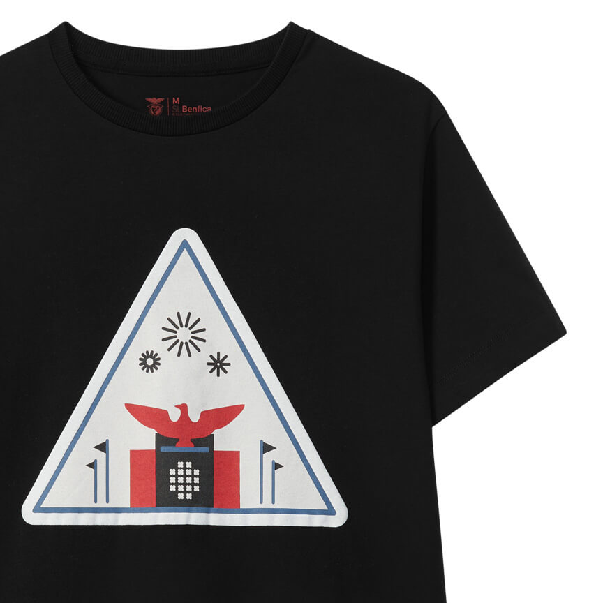 T-shirt noir, coupe régulière, imprimé d'un triangle avec l'image de l'ancien stade du Sport Lisboa e Benfica sur fond blanc.