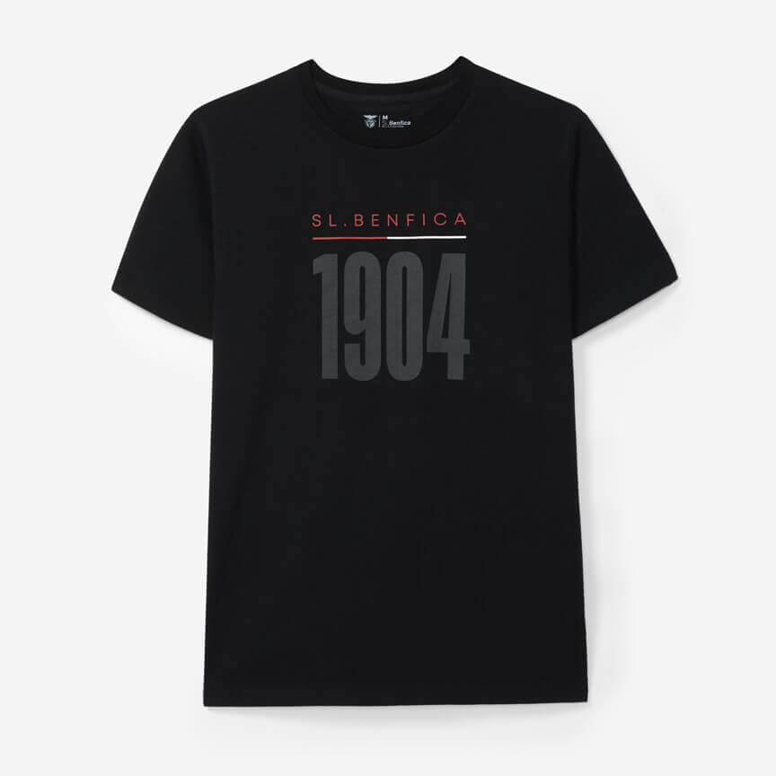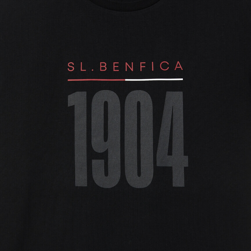 T-shirt noir, modèle à coupe régulière, avec encolure ronde et «SL Benfica» imprimé au centre, en rouge sur une ligne rouge et blanche, et l'année de fondation du club, 1904, en noir.
