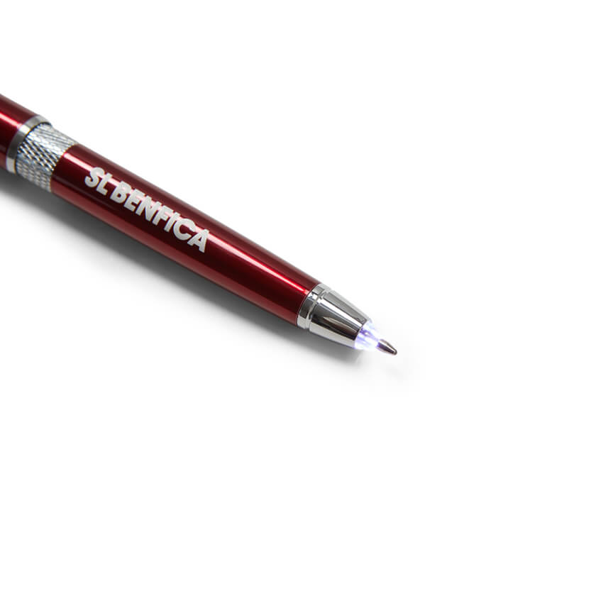 Stylo à bille tactile avec lumière LED blanche du Sport Lisboa e Benfica, en rouge. La mallette de transport est incluse. Le stylo à bille est alimenté par 4 piles LR626.
