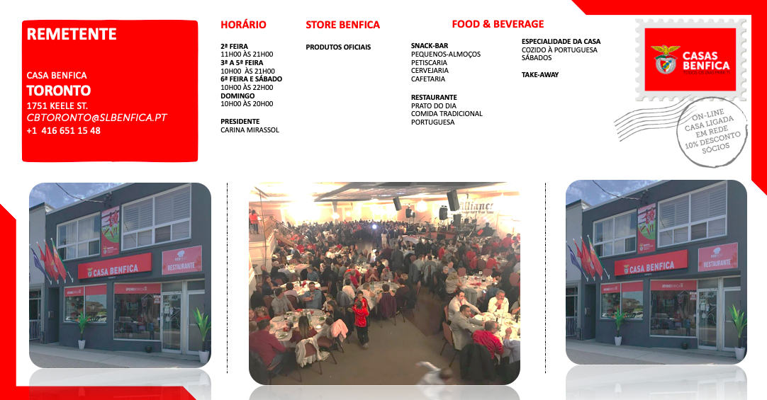 A Casa Benfica Toronto foi fundada em junho de 1969, sendo a primeira reconhecida pelo Sport Lisboa e Benfica. Casa Oficial n.º 6, comemorou a 22 de junho de 2019 o seu 50.º aniversário, numa festa com mais de um milhar de pessoas entre sócios e simpatizantes. Já teve três sedes diferentes, estando agora num espaço bem equipado e já com o Projeto de Uniformização de Imagem e Ligação em Rede ao Clube, sendo a segunda na América do Norte a ter este processo concluído. Esta nova sede, com dois pisos, tem snack-bar e restaurante amplos e acolhedores, com capacidade de servir a melhor qualidade da cozinha tradicional portuguesa. No piso inferior situam-se os escritórios e salas de trabalho da Benfica Soccer School, onde também acontecem as aulas de zumba. É a primeira Escola de Futebol Oficial do Clube a ser dinamizada por uma Casa Benfica e conta com mais de 120 atletas de todas as idades e várias nacionalidades.