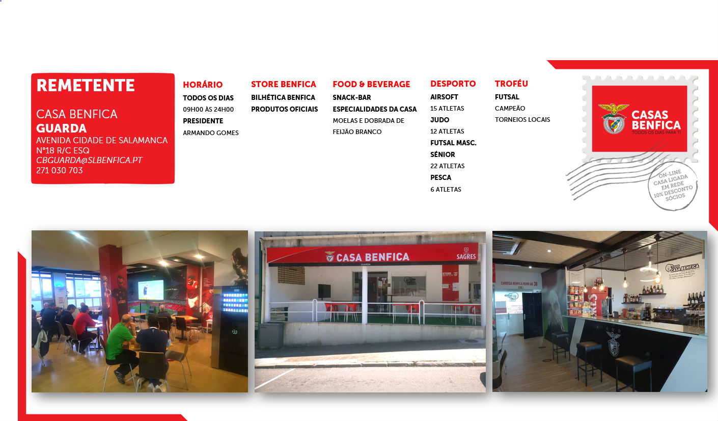 A Casa Benfica Guarda foi fundada em 24 de junho de 1994 e inaugurada em outubro do mesmo ano, pelo Presidente do Sport Lisboa e Benfica, Manuel Damásio. Passou, ao longo destes 25 anos de existência, por várias sedes, estando agora numa das mais concorridas artérias da cidade. Depois de um período de dificuldade associativa, conseguiu reerguer-se em 2013, com um conjunto alargado de Benfiquistas que decidiram reabrir a Casa n.º 42 e implementar um conjunto de serviços e ofertas, onde o Projeto de Uniformização de Imagem ajudou a dinamizar. O Presidente Luís Filipe Vieira inaugurou esta nova sede em 10 de outubro de 2015 num almoço que juntou centenas de pessoas no NERGA. A componente desportiva é também uma das suas prioridades, com secções que dinamizam pessoas de todas as idades. Tem esperança de que em breve possa também ter na cidade a Casa Benfica 2.0 e que, da parceria entre o SL Benfica e a Câmara Municipal da Guarda, saia reforçada e com mais e melhores serviços para toda a população.