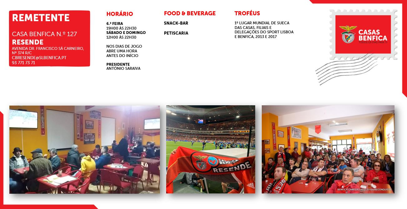 A Casa Benfica Resende nasceu no ano de 2002, quando 11 benfiquistas se juntaram no salão da Junta de Freguesia para a realização de um sonho de muitos resendenses. Inicialmente num espaço pequeno, o edifício mudou, mas a Casa Oficial n.º 127 manteve-se na Avenida Dr. Francisco Sá Carneiro. Oferece um conjunto de serviços exclusivos aos sócios em eventos do Clube e através de atividades de lazer como matraquilhos, snooker, convívios com petiscos, entre outros. Tem como ex-líbris os torneios de Sueca, sendo disso demonstrativo os títulos de campeão do Torneio Mundial de Sueca das Casas, Filiais e Delegações do Sport Lisboa e Benfica, em 2013 e 2017. Durante a época desportiva, conta com diversos eventos (além de todos os jogos do Clube), o que torna a associação ativa para os benfiquistas e para toda a comunidade.