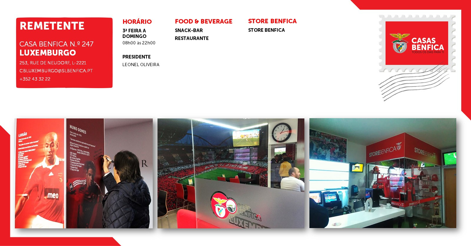 A embaixada n.º 247 do Sport Lisboa e Benfica abriu portas no Luxemburgo em 30 de janeiro de 2015. No mesmo ano, no fim do mês de novembro, o então Presidente do Clube, Luís Filipe Vieira, acompanhado do ex-jogador Nuno Gomes, inaugurou o espaço já com a nova imagem das Casas Benfica, num momento muito especial para toda a Família Benfiquista do Grão-Ducado. A nova imagem da Casa tem uma foto muito especial do ex-jogador do Clube, a qual Nuno Gomes autografou. Em dia de jogo do Benfica vive-se um ambiente empolgante, sempre com boa comida, como os famosos Bifes à Catedral ou o Bacalhau à Casa.