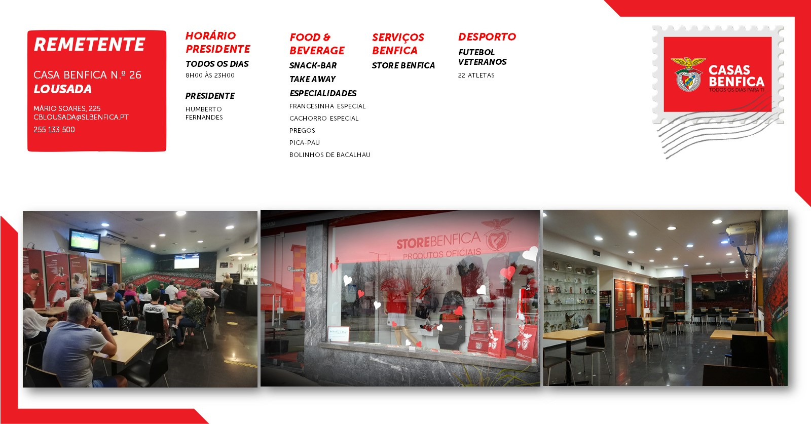 A segunda casa de muitos Benfiquistas de Lousada está prestes a completar 30 anos de existência. Abriu as suas portas a 14 de março de 1992. Anos mais tarde, a 6 de novembro de 2010, foi inaugurada pelo Presidente do Sport Lisboa e Benfica, na altura Luís Filipe Viera. Em 2020 foi remodelada e recebeu a nova imagem das Casas Benfica, com a ambição de rejuvenescer a Casa e levar os jovens para dentro. O futebol e o atletismo sempre estiveram presentes nesta embaixada, que já teve um atleta nas maratonas de Paris e de Barcelona. Atualmente com quase 800 Sócios, procura uma sede maior para oferecer o melhor.