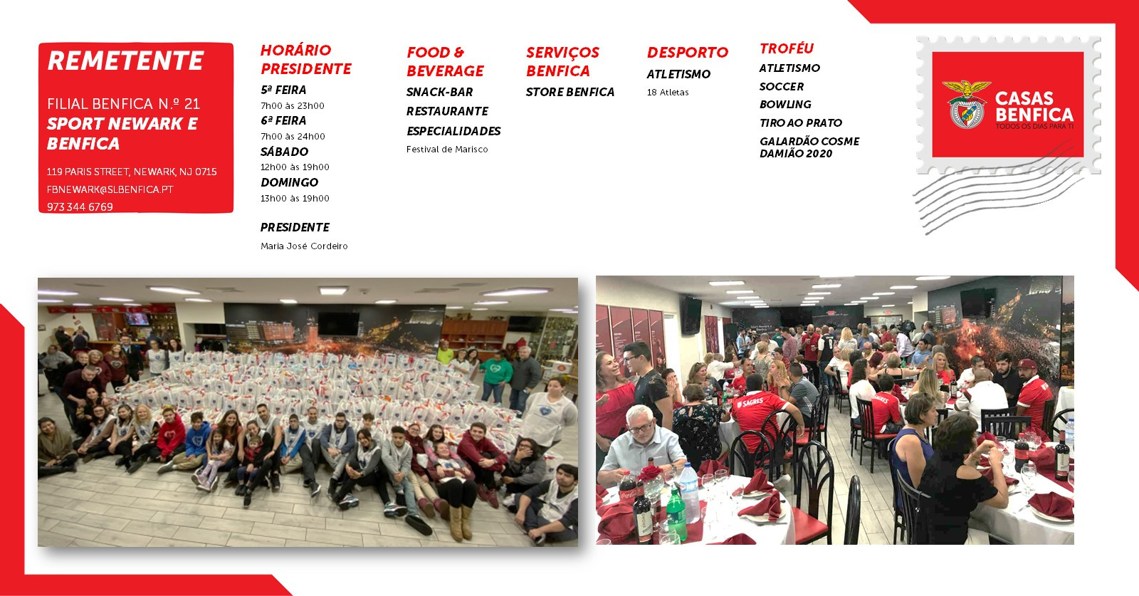A Filial 21 do Sport Lisboa e Benfica é um orgulho para os fãs do Clube na terra do Tio Sam. Nova Jérsia tem uma comunidade benfiquista muito forte e há mais de 40 anos tem um espaço para viver a Mística, mesmo tão longe da casa-mãe. O Sport Newark e Benfica foi fundado a 25 de novembro de 1969 e inaugurado 10 anos mais tarde, a 1 de julho de 1979. Em 2018 recebeu a nova imagem das Casas Benfica, numa festa para dezenas de Benfiquistas. A atual direção, que tem a primeira mulher a presidir a uma embaixada do Clube, pauta o trabalho em servir os seus. Em 2019, entregaram uma média diária de 60 caixas de comida a uma fundação que se encarregava de distribuir por quem precisava. Por esta e por outras ações, recebeu a distinção Casa Benfica do ano de 2020, o que encheu a todos de muitos brios.