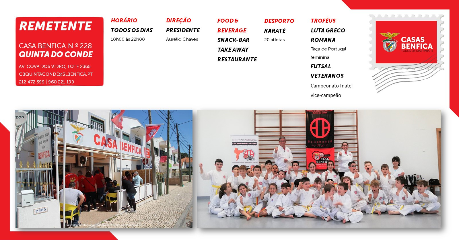 Boa gastronomia e grandes conquistas no desporto, em particular o karaté, o futsal e o atletismo, fazem da Casa Benfica Quinta do Conde uma referência local. A pandemia encerrou, momentaneamente, a secção do futsal e do atletismo, mas deu força ao karaté, que conta com atletas de todas as idades. A embaixada n.º 228 do Clube vai para os 14 anos de vida, pois abriu portas a 26 de junho de 2008, e está prestes a celebrar mais um aniversário. Do ambiente ao bacalhau, e ambos impecáveis, esta Casa é um espaço de bons convívios.