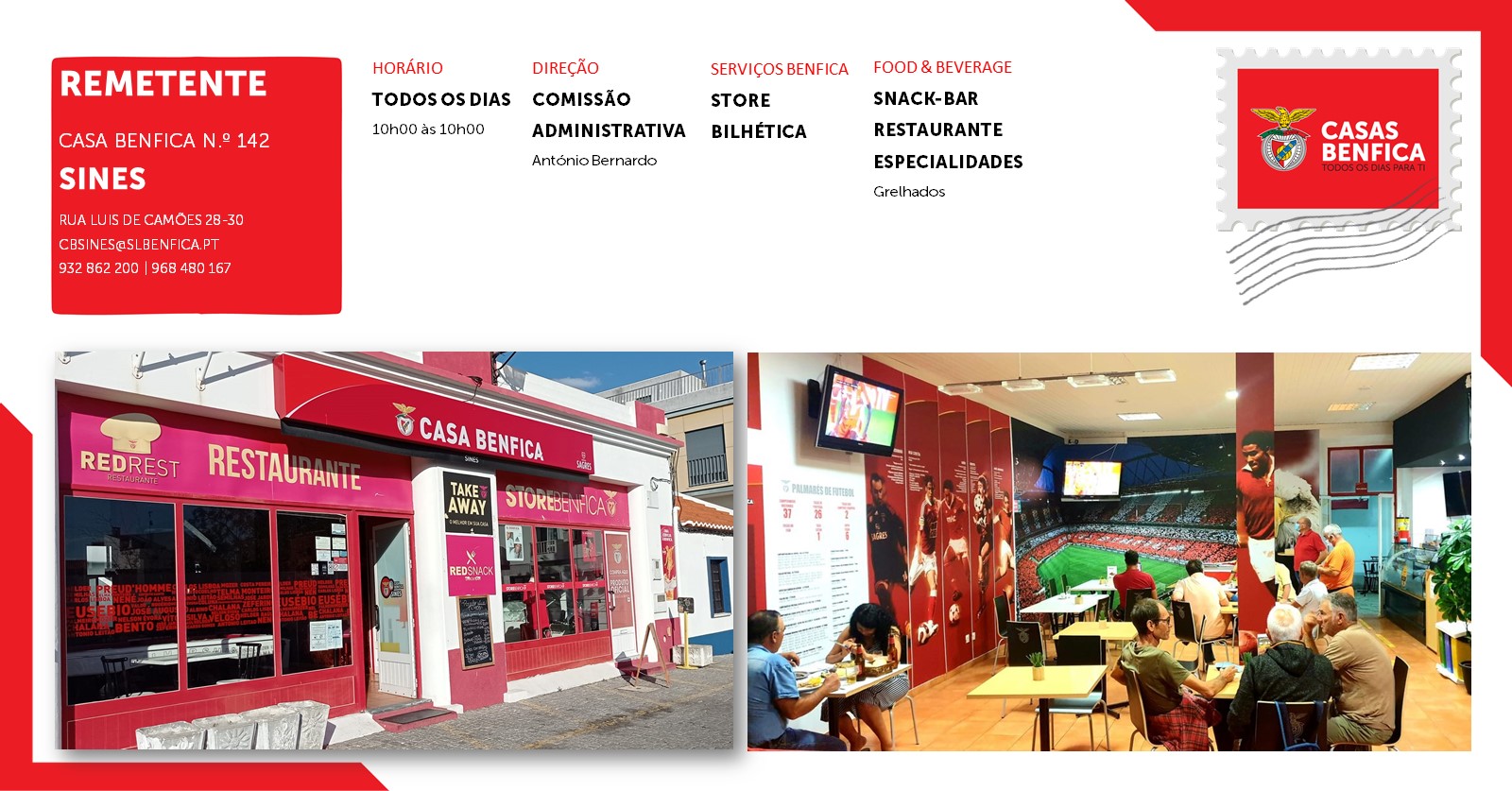 Desde 2019 com o projeto de uniformização de imagem em vigor, a Casa Benfica Sines abriu portas a 7 de outubro de 2002 com todos os serviços Benfica. Atualmente, a embaixada encarnada passa por uma reestruturação, com a implementação de uma gestão mais moderna, que permitirá a realização de projetos sociais e desportivos a longo prazo.