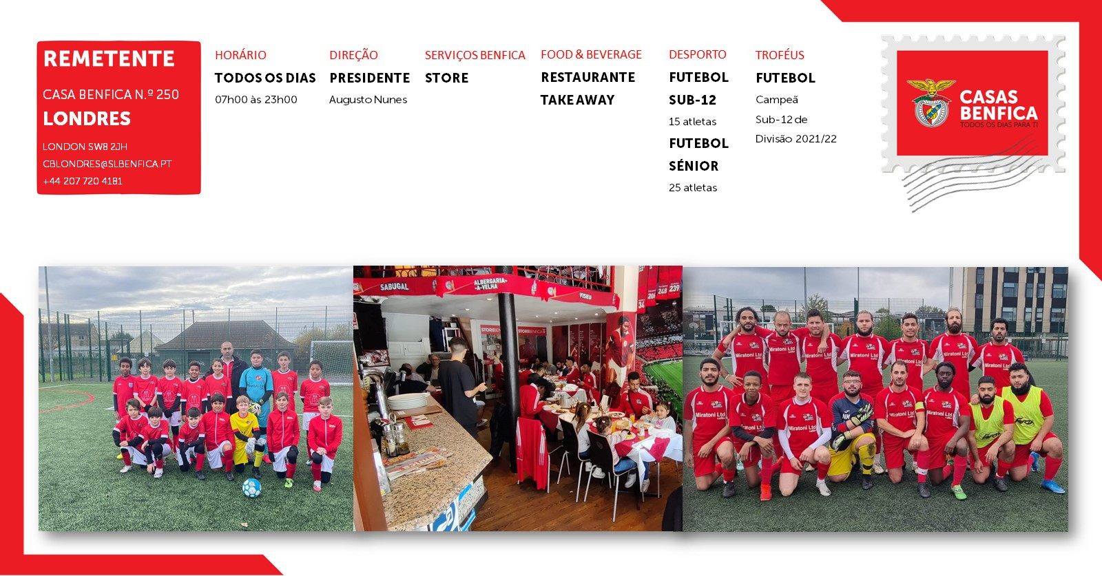 Foi no Dia de Portugal em 2014 que um grupo de amigos benfiquistas resolveu dar asas ao sonho de ter uma embaixada do Clube em Londres, e a 12 de novembro do mesmo ano o sonho tornou-se realidade, quando a Casa abriu as suas portas. Desde então é muito bem frequentada por todos, inclusive adeptos dos outros clubes, que vão à Casa Benfica Londres para experimentar a boa e tradicional comida portuguesa. Destaca-se no futebol e na sueca e ambiciona ter mais atividades num espaço maior.