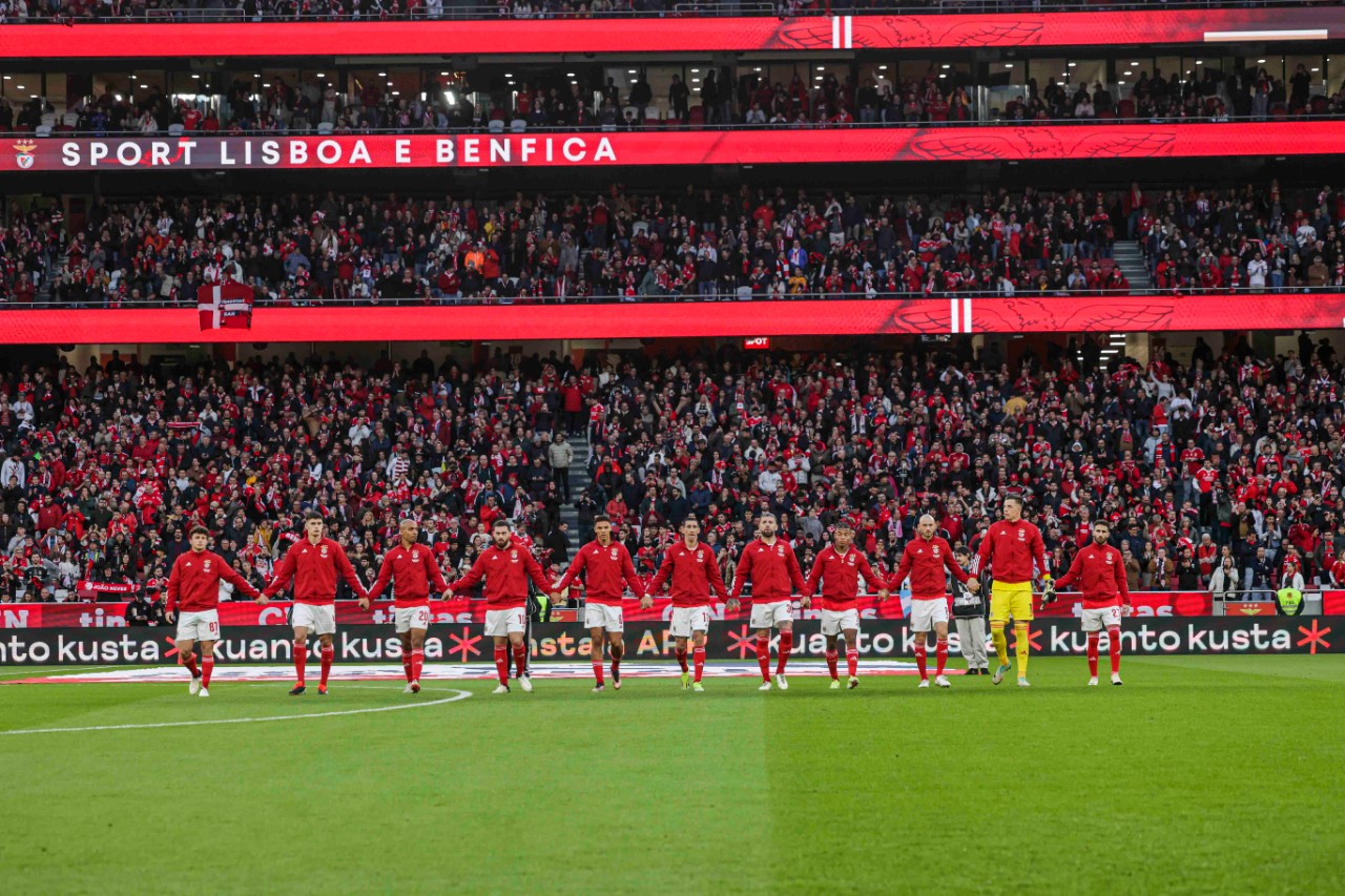Jogadores encarnados durante o minuto de silêncio em memória das duas figuras do futebol do Clube