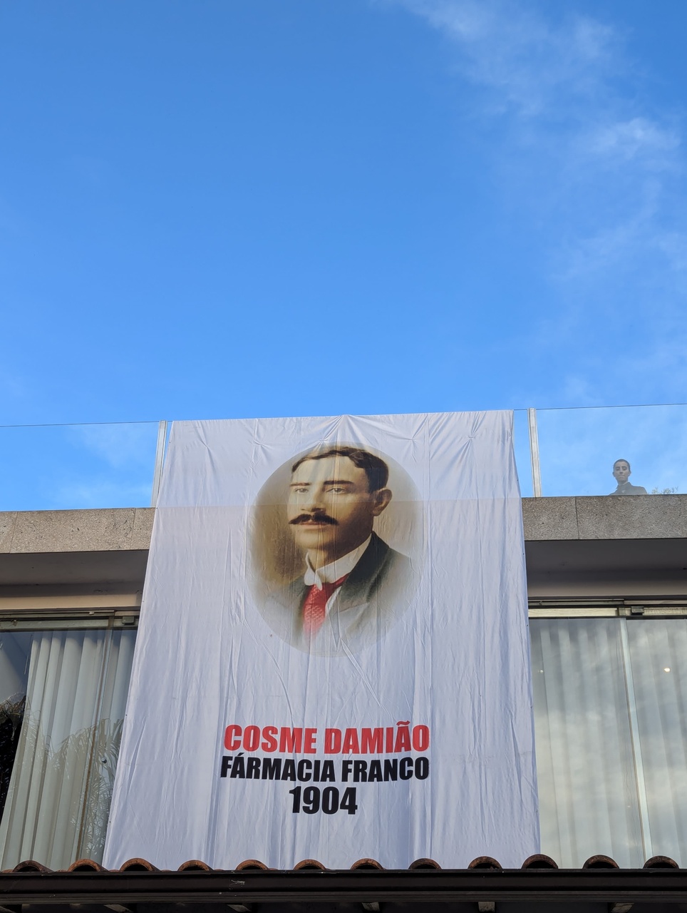 Pano com a imagem de Cosme Damião, um dos fundadores do Sport Lisboa e Benfica