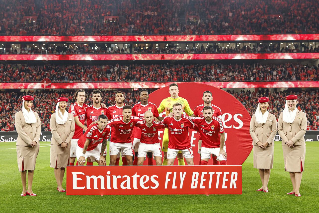 O onze inicial do Sport Lisboa e Benfica, com a presença de representantes da Emirates, empresa parceira do Clube, que realizou uma ação antes do início do jogo