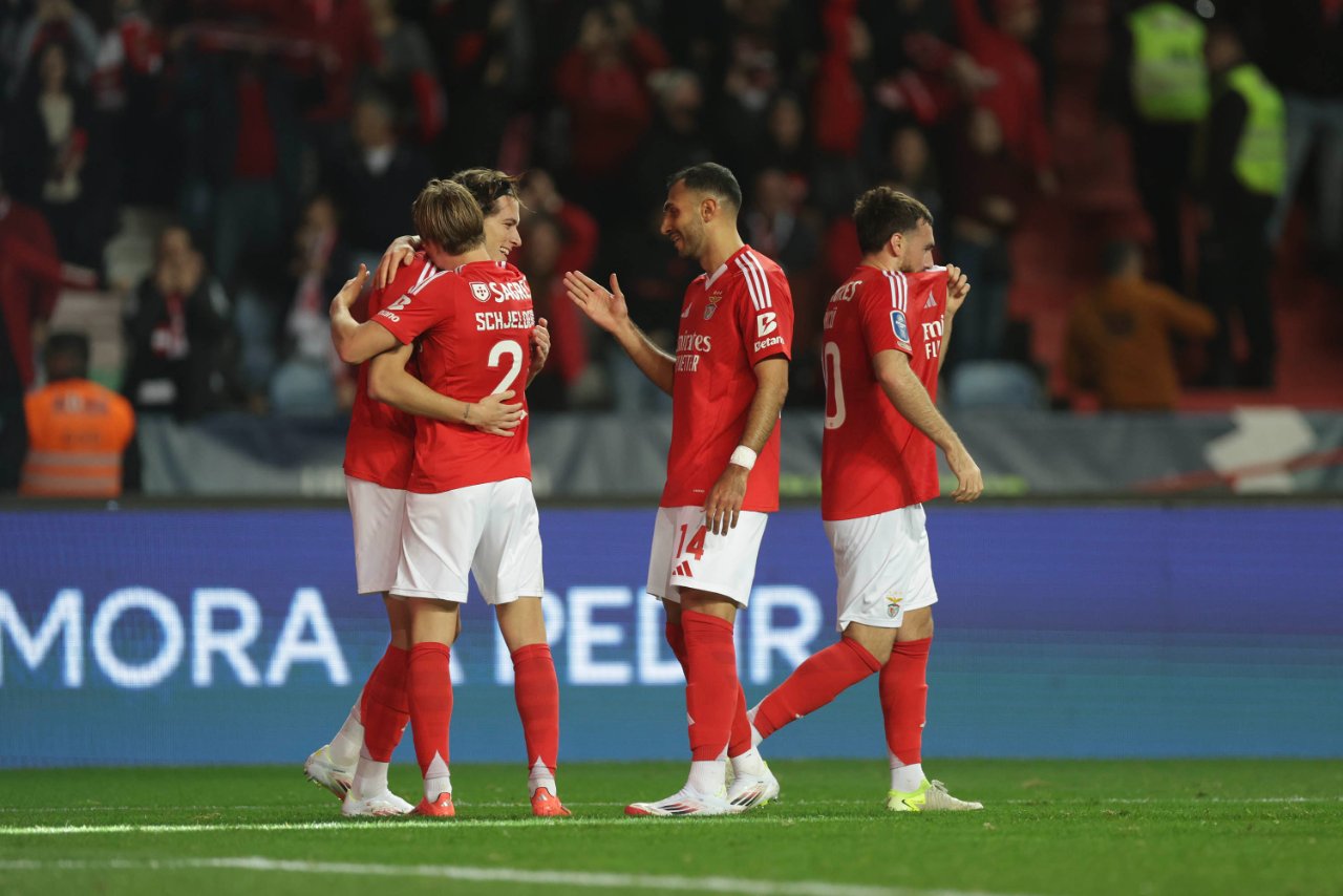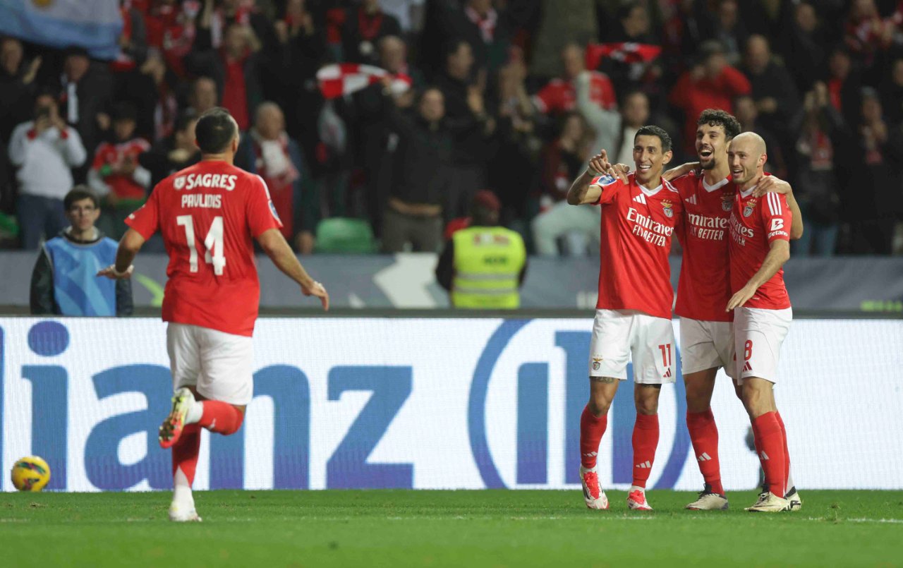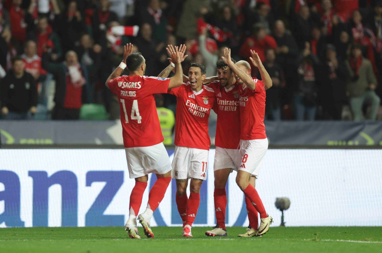 Celebração envolvendo Pavlidis, Di María, Tomás Araújo e Aursnes