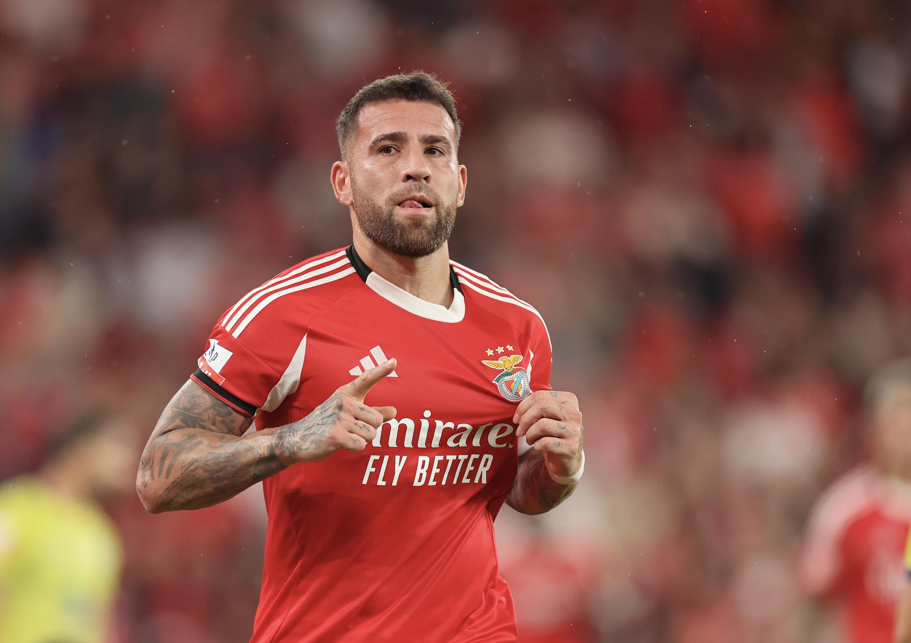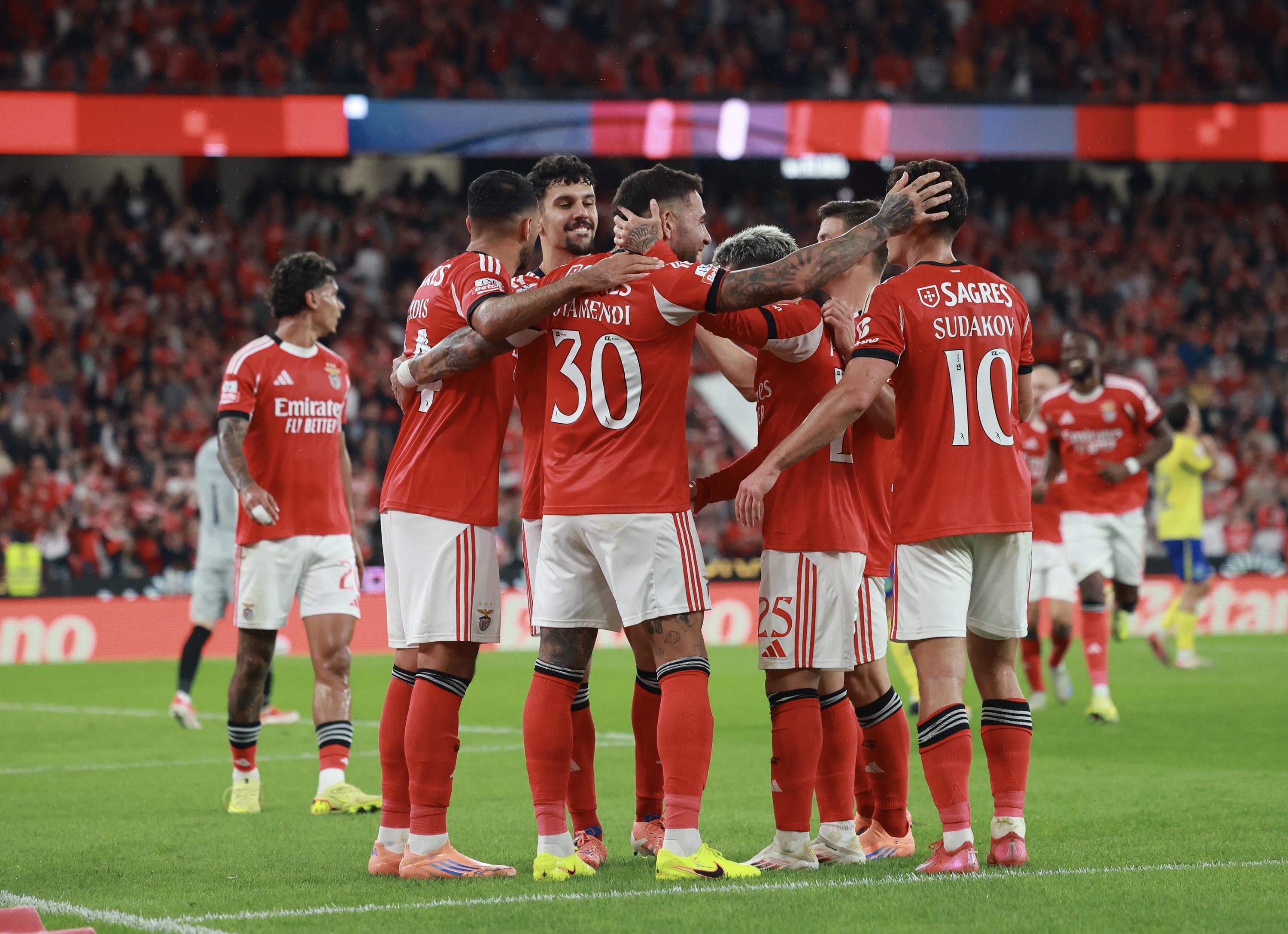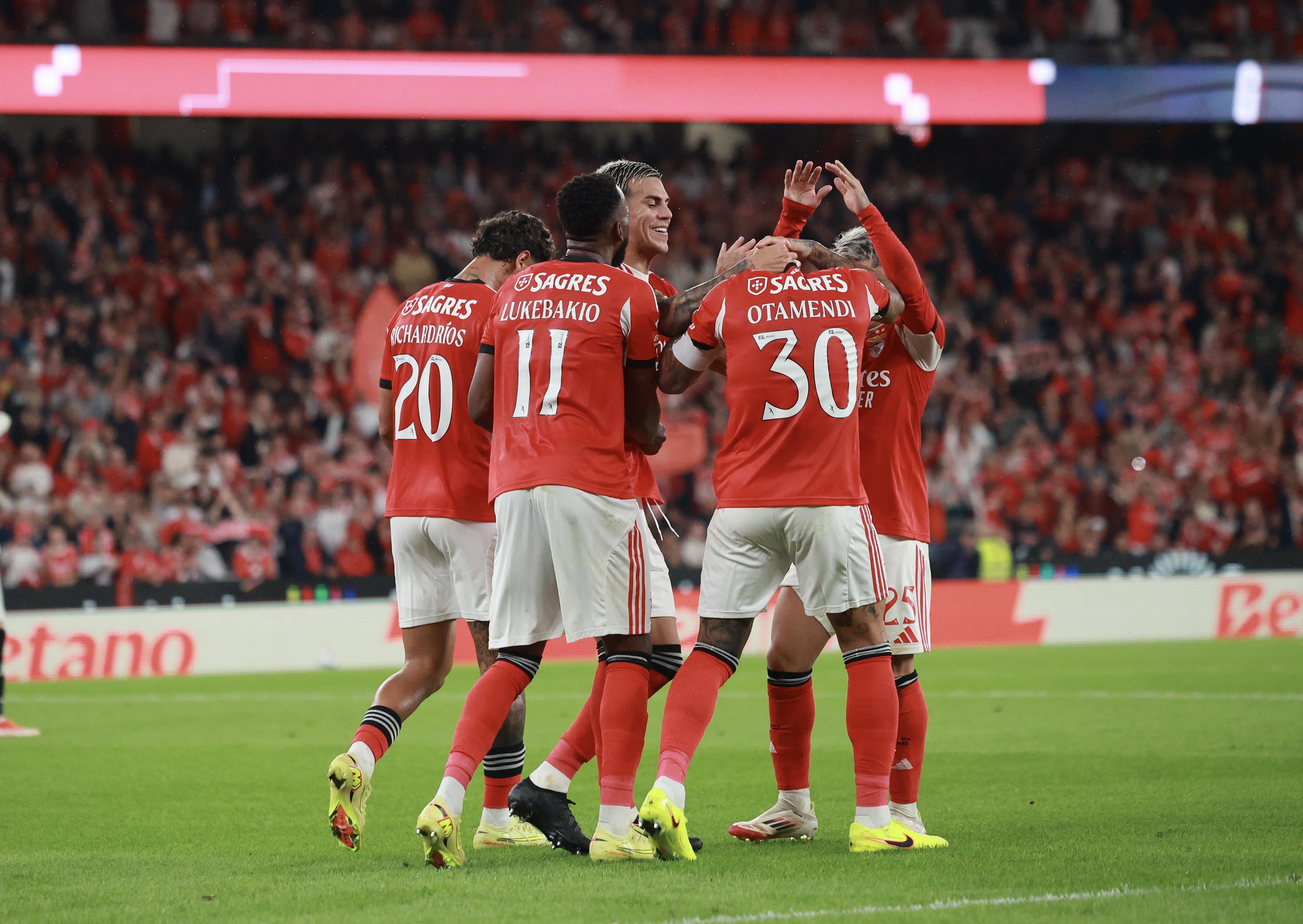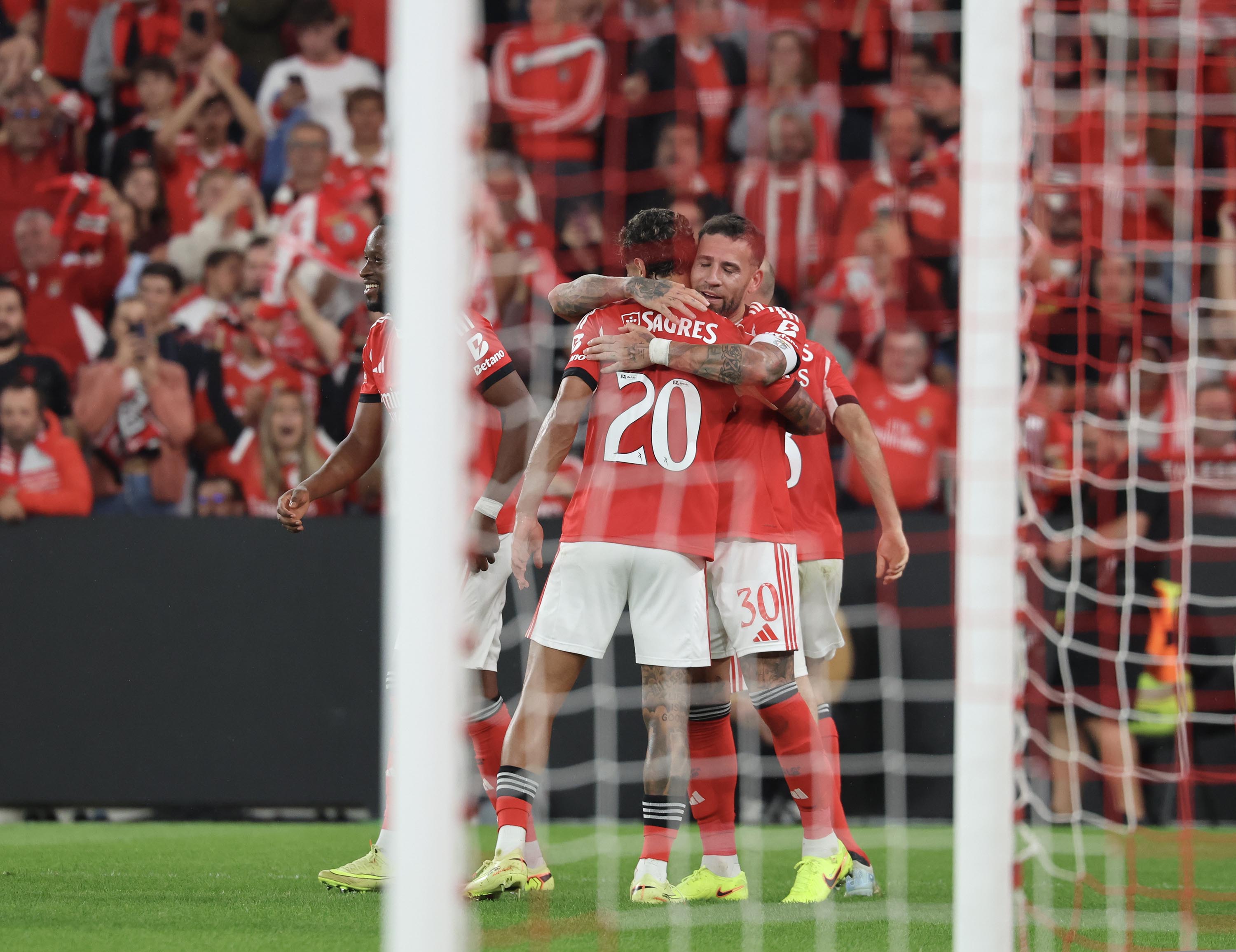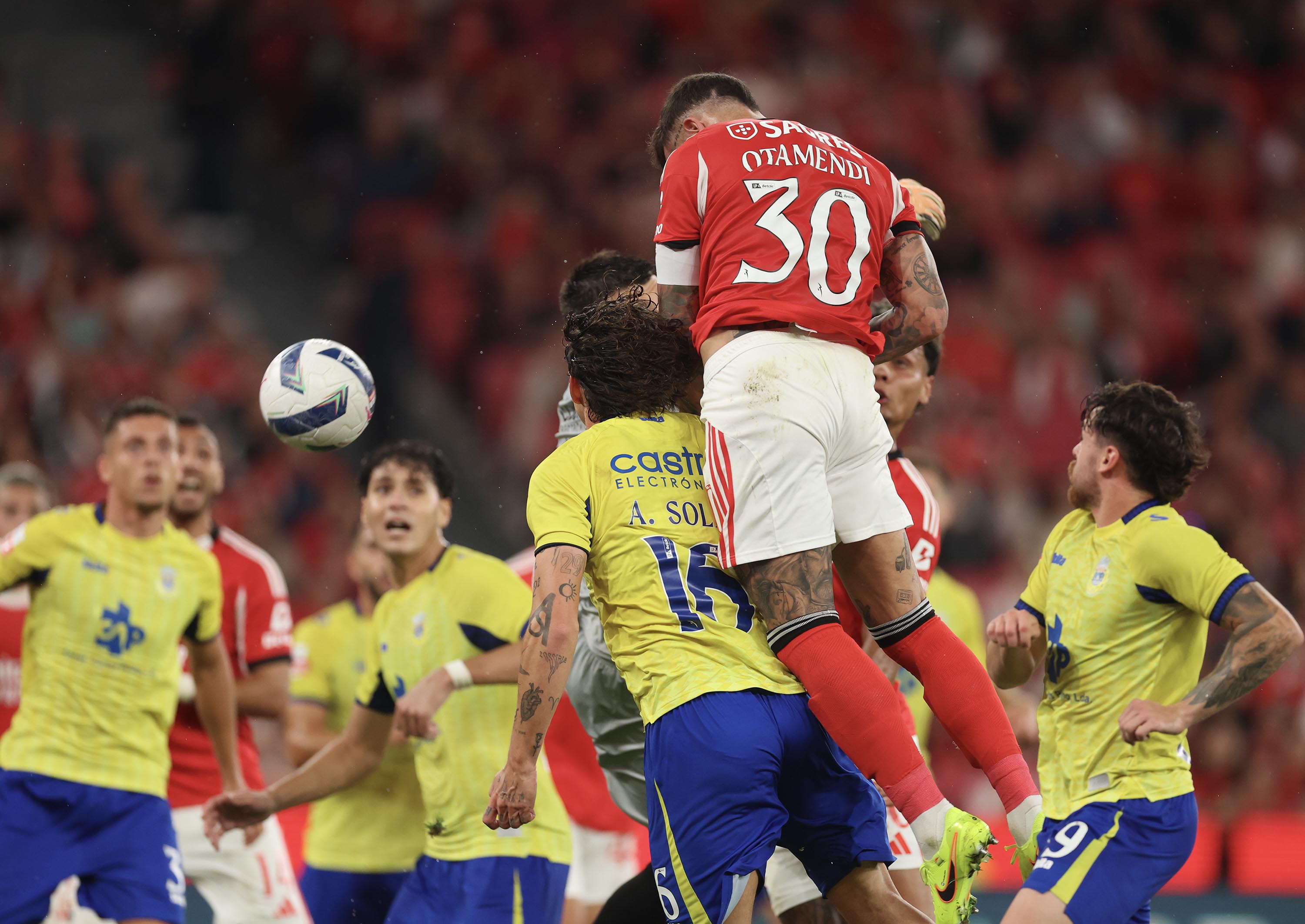 Otamendi, nas alturas, a cabecear para o 3-0, aos 45'+6'