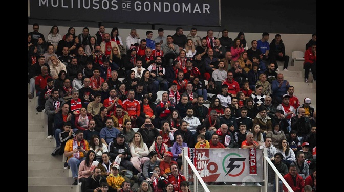 Pavilhão Multiusos de Gondomar com lotação esgotada para o efeito (2530 espectadores), recinto que na tarde deste mesmo domingo viu a equipa feminina das águias vencer o Nun'Álvares (4-1), erguer o troféu... e dar o mote!