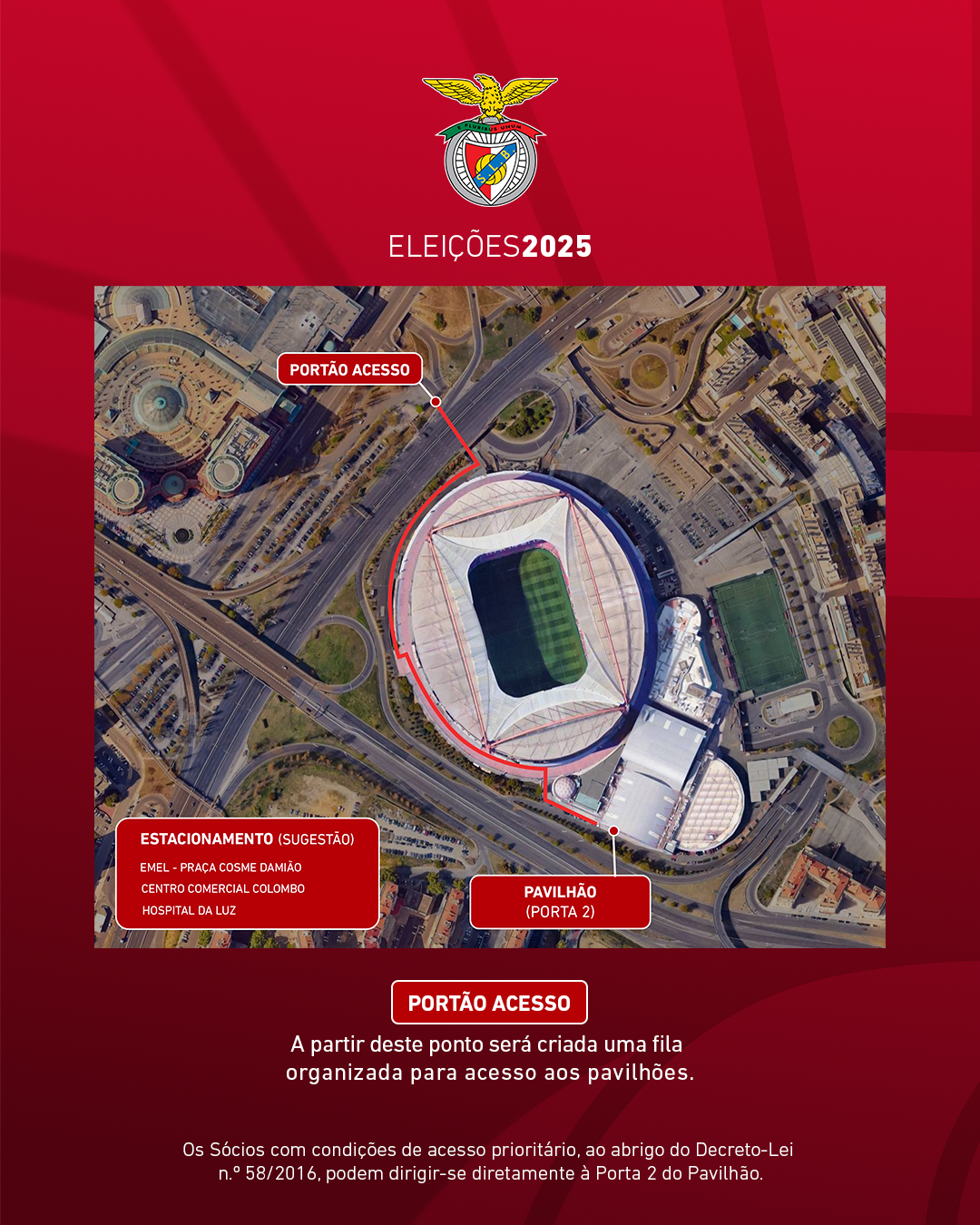 A entrada no Complexo do Estádio da Luz deverá ser feita pelo portão de acesso situado junto ao Centro Comercial Colombo, sugerindo-se o estacionamento nos parques da EMEL – Praça Cosme Damião, do Centro Comercial Colombo e do Hospital da Luz.