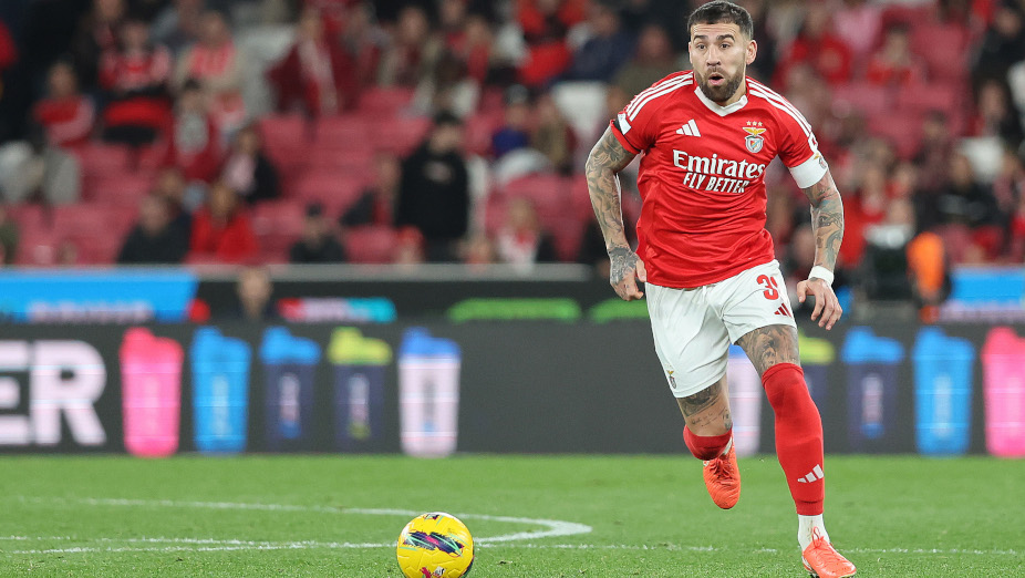 Otamendi sobe pelo lado direito, mas o seu cruzamento sai diretamente para fora.