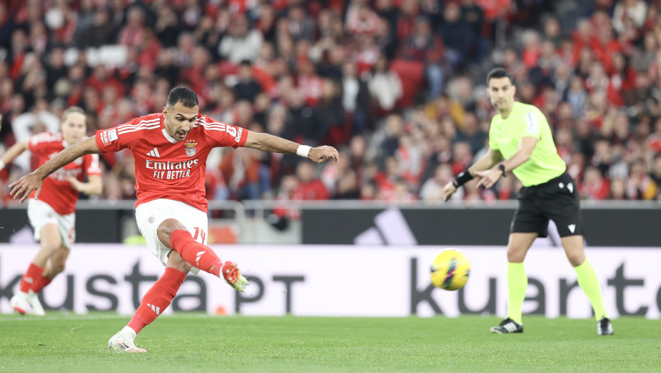 A passe de Amdouni, Bruma escapa-se pela esquerda, invade a área e remata. Mas é assinalado fora de jogo ao avançado do Benfica.
