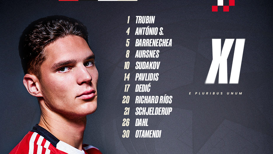 Trubin, António Silva, Barrenechea, Aursnes, Sudakov, Pavlidis, Dedic, Richard Ríos, Schjelderup, Dahl e Otamendi.