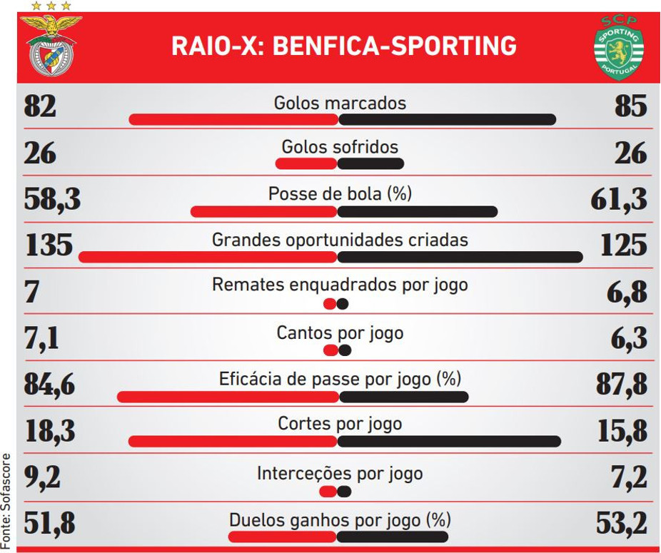 Destaque, também, para a vantagem vermelha e branca no número total de grandes oportunidades criadas ao longo do que já se jogou neste Campeonato: 135 contra 125.