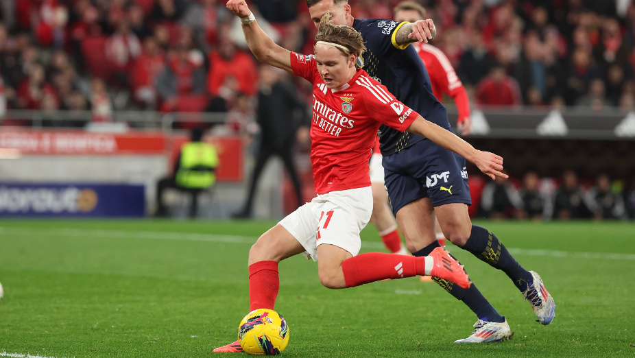 Schjelderup cruza para alívio oponente. Lançamento para o Benfica.