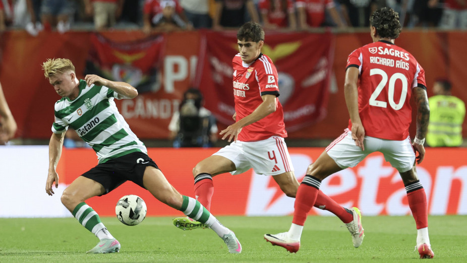 Bola sai para Richard Ríos, mas a defesa do Sporting antecipa-se.