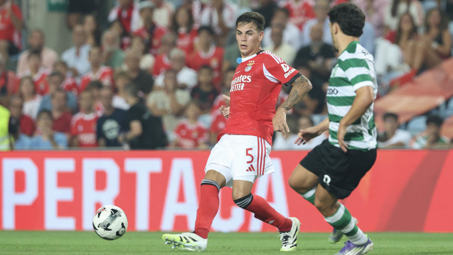 Livre de Prestianni para Otamendi, mas este não chega a tempo à bola.