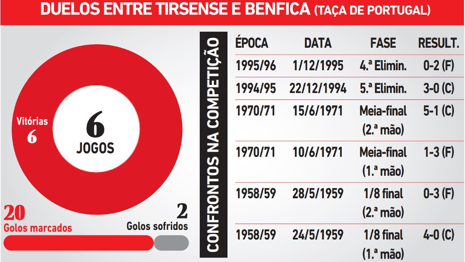 O último embate entre as equipas para a prova-rainha ocorreu há pouco mais de 29 anos (dia 1 de dezembro de 1995), com o Benfica a superiorizar-se ao Tirsense, por 0-2, na 4.ª eliminatória da edição 1995/96 da Taça de Portugal, a qual as águias haveriam de conquistar.