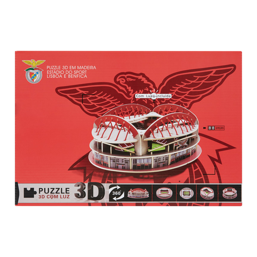 Puzzle 3D em madeira do Estádio da Luz, classificado como produto de coleção. O Estádio do Sport Lisboa e Benfica (nome oficial), também conhecido como "A Catedral", está situado ...