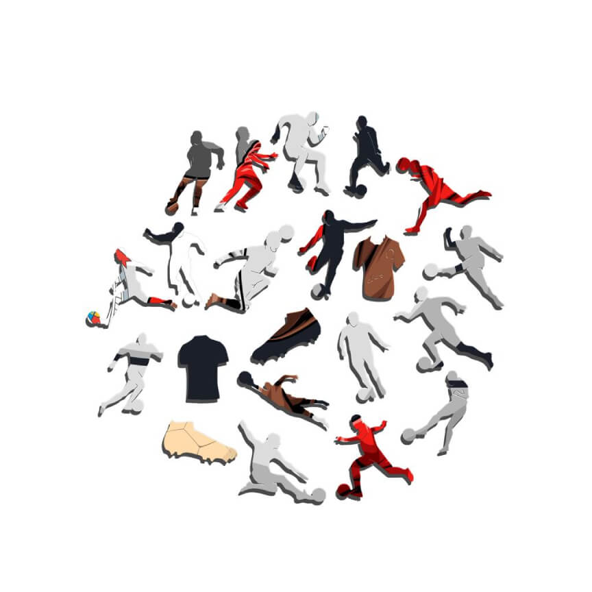 Peças feitas em madeira sustentável com 0,5 cm de espessura. As peças têm formatos relacionados com o mundo do futebol.