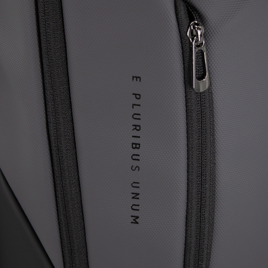 A mochila executiva SL Benfica de cor cinza tem a impressão do emblema e do lema do clube em preto e a etiqueta em borracha.