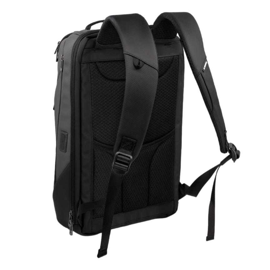 Tem uma bolsa interior almofadada para um portátil, bem como bolsas organizadoras para diferentes acessórios. A pega extensível torna esta mochila adaptável a trolley de viagem.