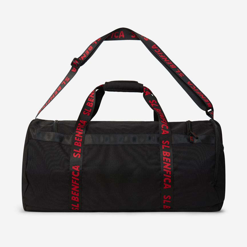 O transporte do saco pode ser feito através de uma cinta ajustável ou uma pega central, ambas com a inscrição "SL Benfica", a vermelho.