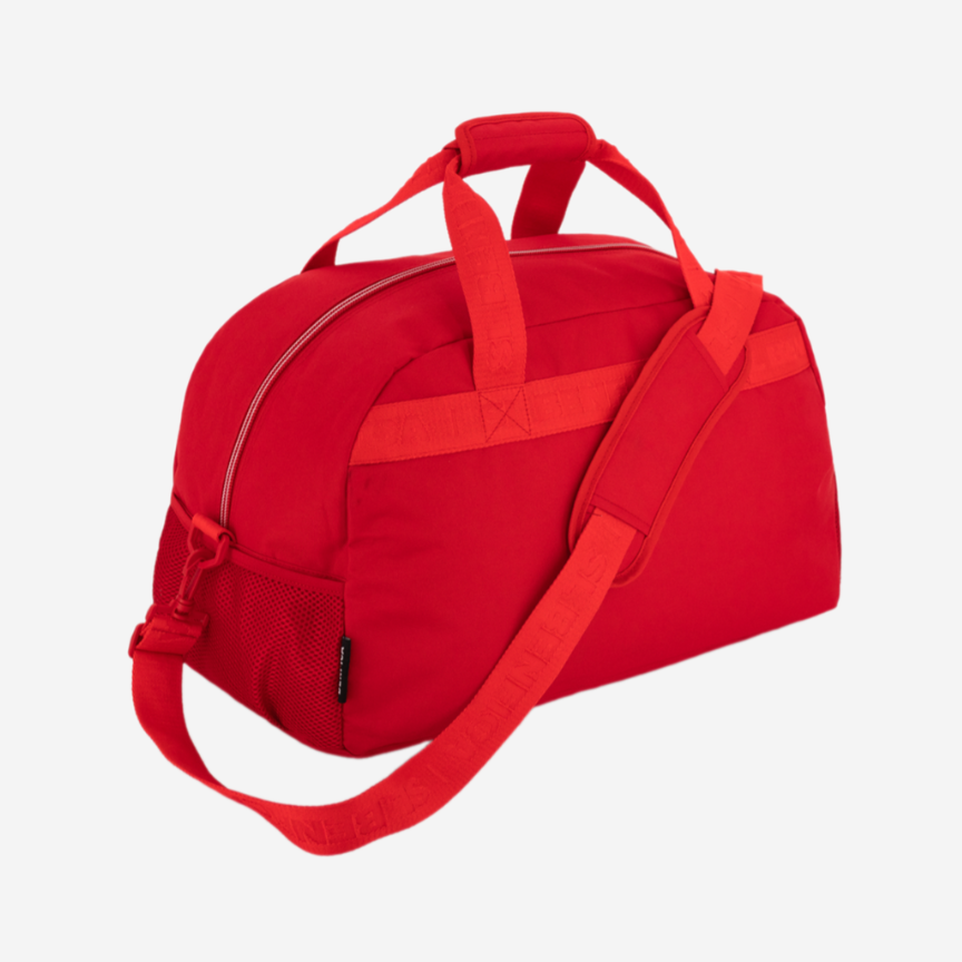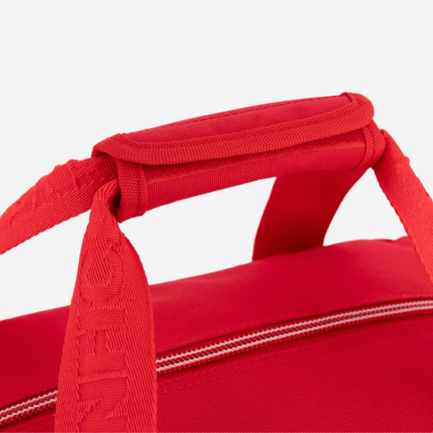 Saco de desporto vermelho, com o emblema do Sport Lisboa e Benfica, aplicado ao centro.