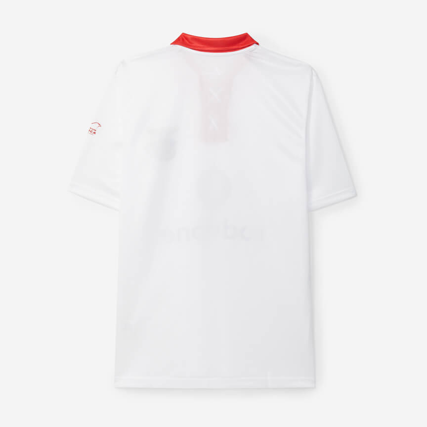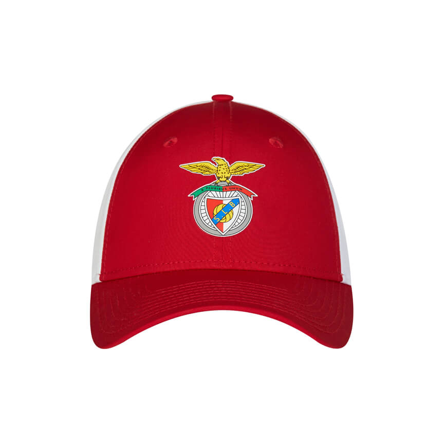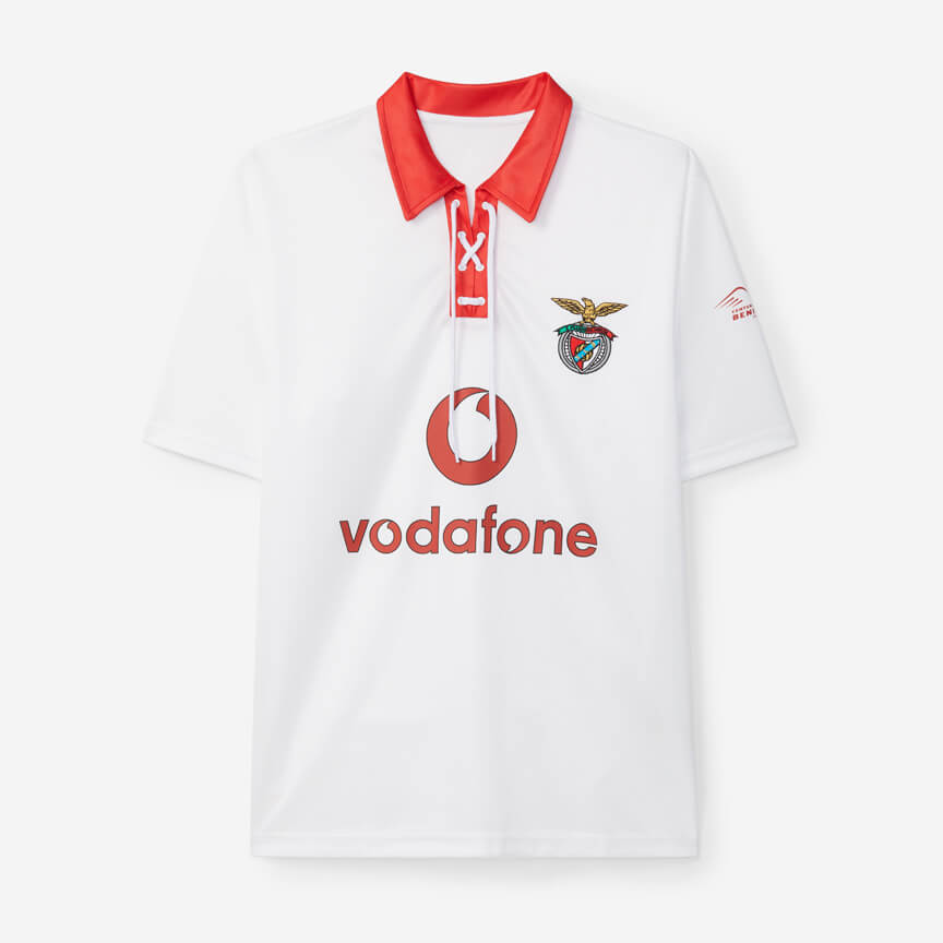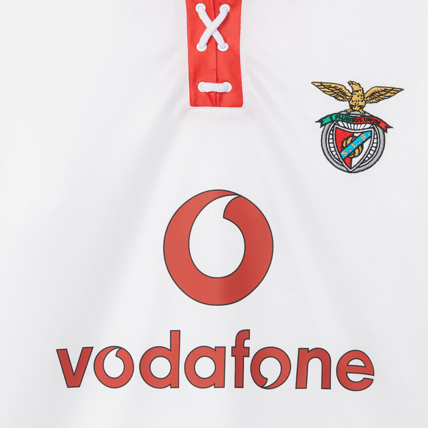 Sobre o lado esquerdo do peito, temos o emblema do SL Benfica, bordado na camisola. A camisola é composta por um colarinho vermelho, acompanhado de uma carcela, também em vermelho, e que podem ser ajustados a gosto através de cordões brancos.