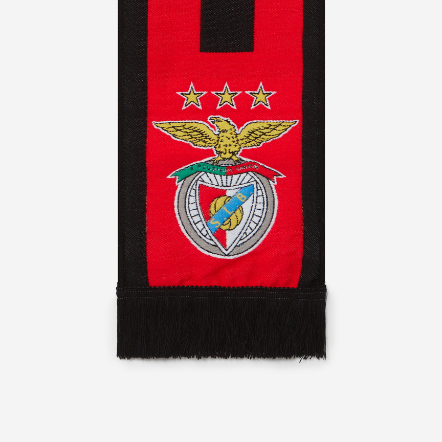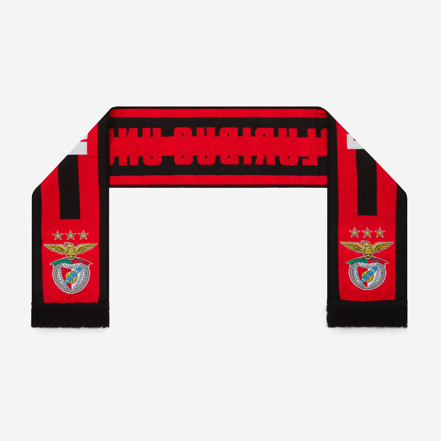 O cachecol é composto por um outline preto e pelo emblema do Sport Lisboa e Benfica, nas pontas.