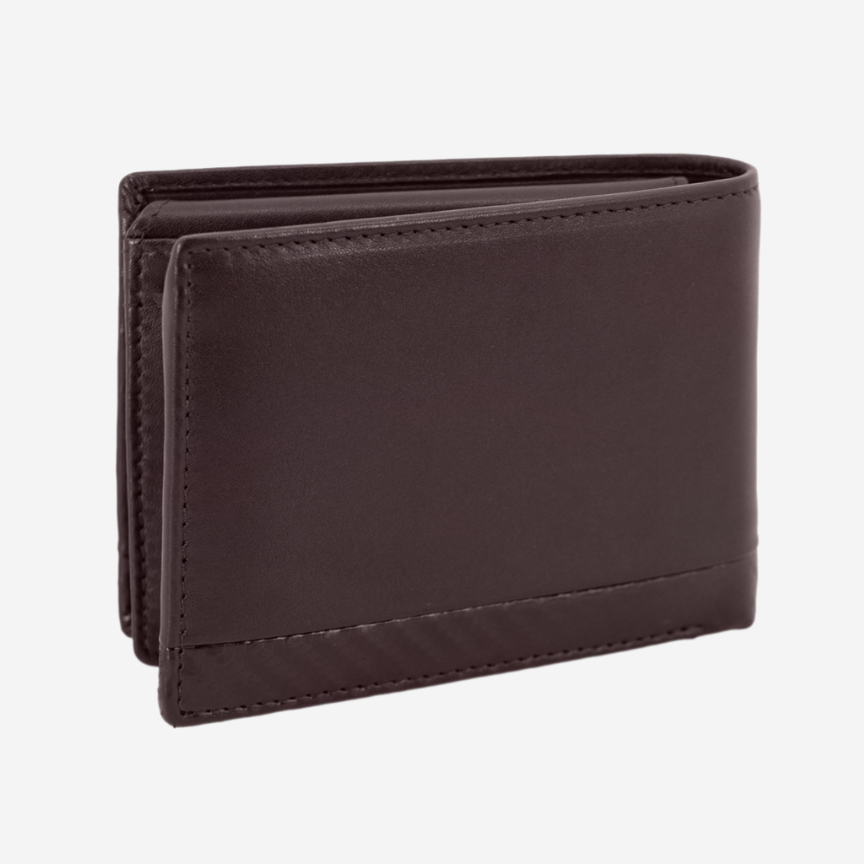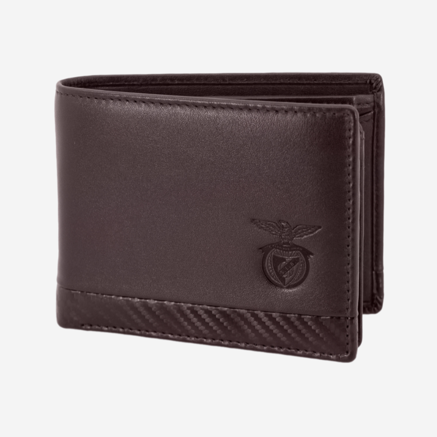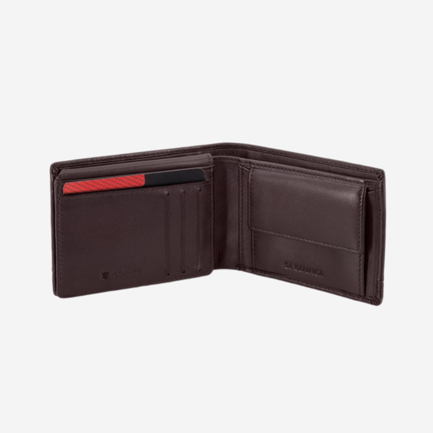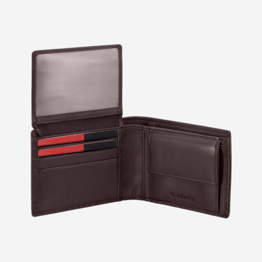 Carteira castanha pequena, em pele genuína, do Sport Lisboa e Benfica. O interior da carteira é composto por compartimentos para cartões, notas ou pequenos documentos e um porta-moedas....