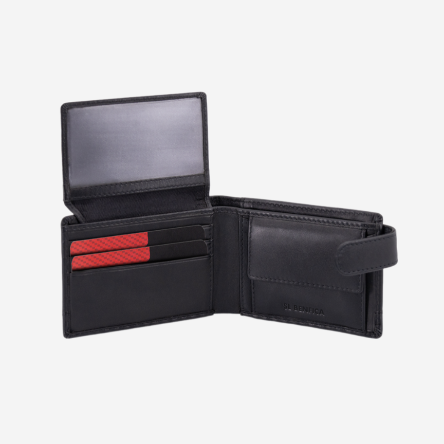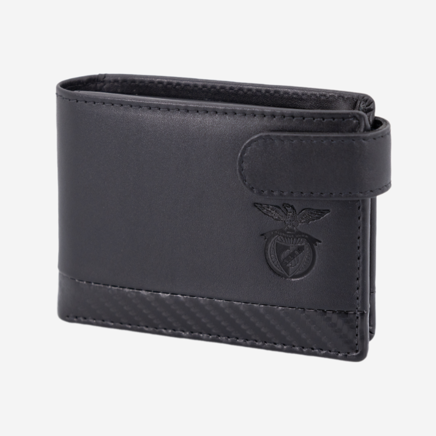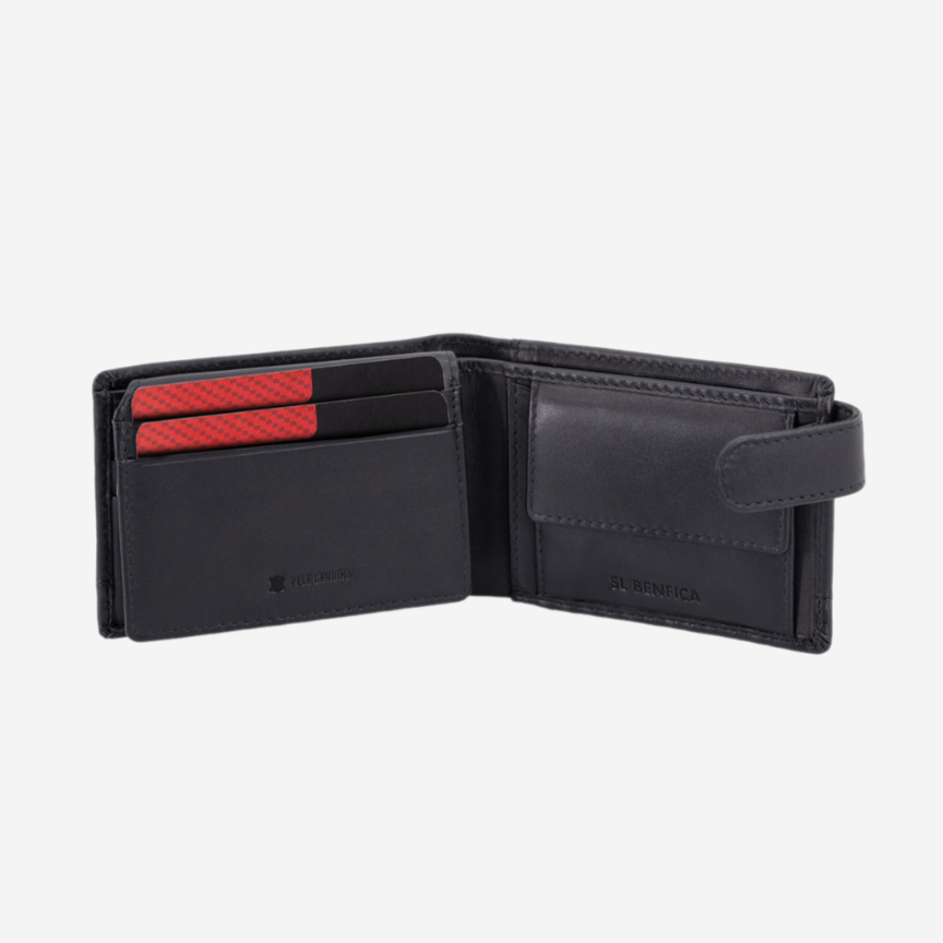 Carteira preta pequena com presilha, em pele genuína, do Sport Lisboa e Benfica.