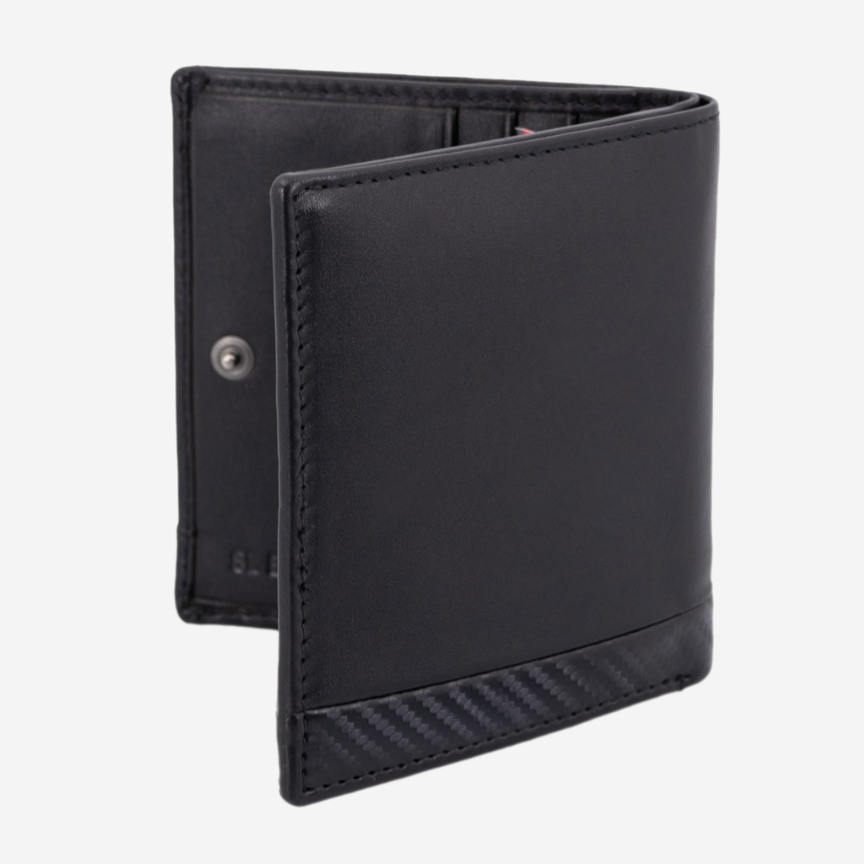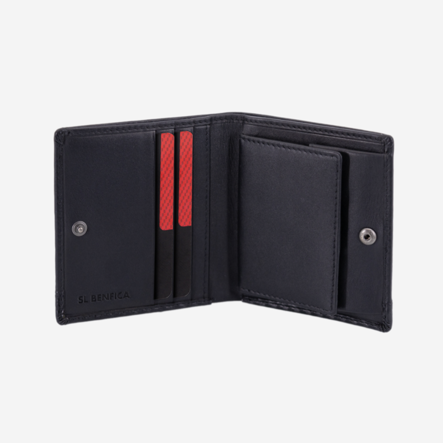 Carteira preta, em pele genuína, do SL Benfica. A carteira é composta por um moedeiro, que se desdobra e impede que as moedas caiam, e por três compartimentos para cartões, a que se junta ...