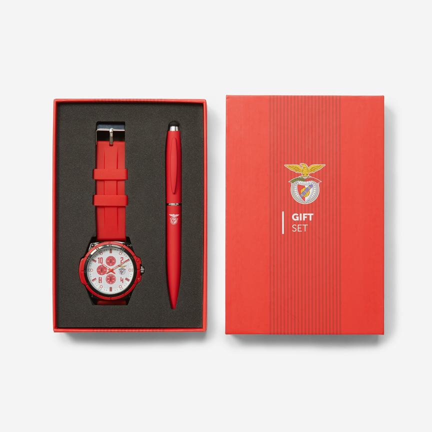 Este set é composto por um relógio, com o emblema do Sport Lisboa e Benfica e por uma caneta esferográfica também com o emblema do clube.