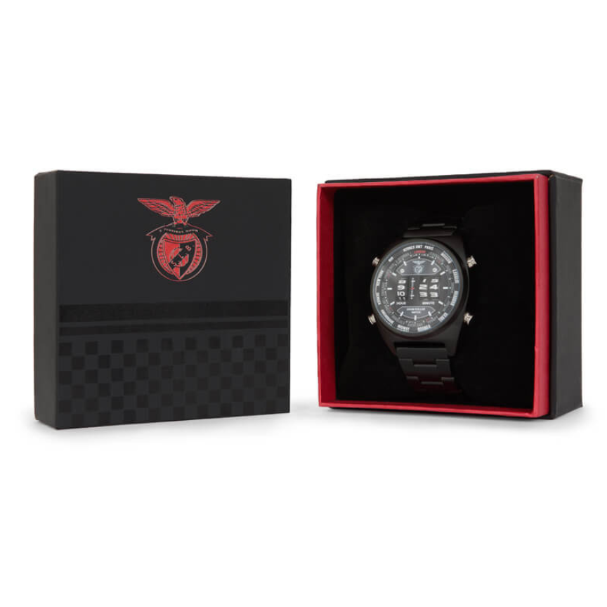 Relógio chrono do Sport Lisboa e Benfica com bracelte metálica. Mostrador cinza escuro com o emblema do clube a branco e quatro botões para efetuar o ajuste horário. Mostrad...
