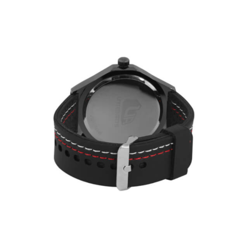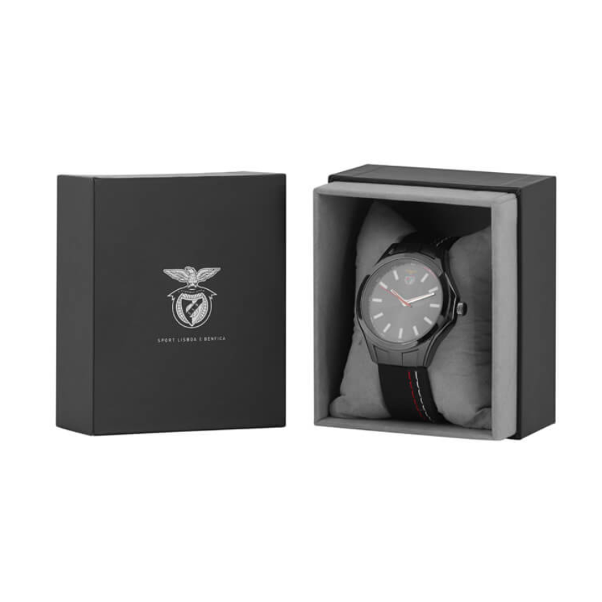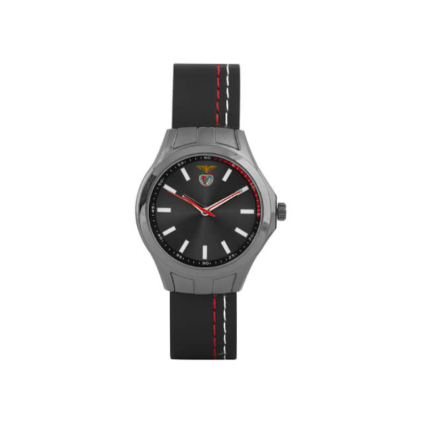 Relógio com movimentos de quartzo, bracelete preta com detalhes em vermelho e branco e fecho de fivela. O fundo do mostrador é preto com o emblema do clube, ponteiros que indicam as horas, os minutos e os segundos.