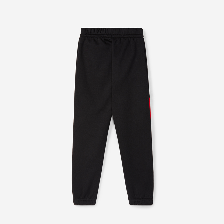 Calças pretas com pormenor vermelho nas pernas e a inscrição "Benfica", acompanhada do logo da Adidas, a branco, na perna esquerda.