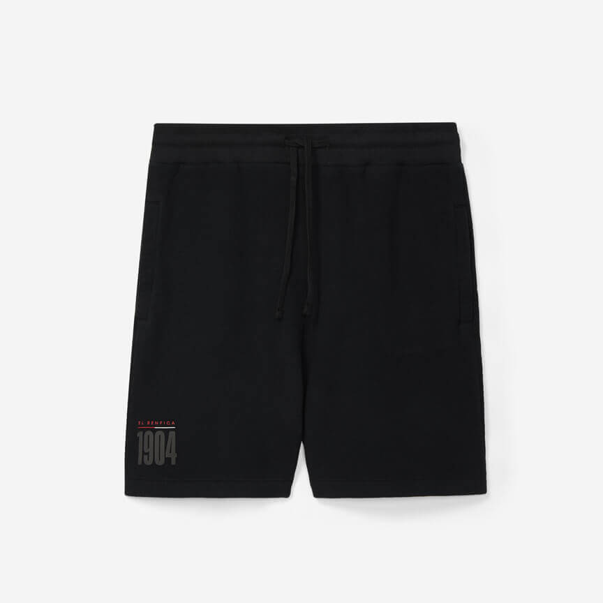Calções pretos cardados com cordão na cintura para ajustar a gosto, bolsos laterais e estampagem, na perna direita, de “SL Benfica”, a vermelho sobre uma linha vermelha e branca, e o ano de fundação do clube, 1904, a preto.
