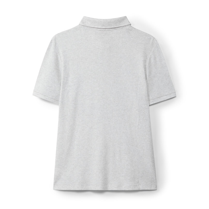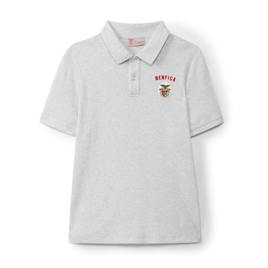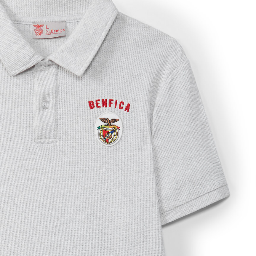 Polo cinzento com gola em V com carcela com dois botões e Benfica bordado a vermelho sob o emblema Vintage do clube, no lado esquerdo do peito.