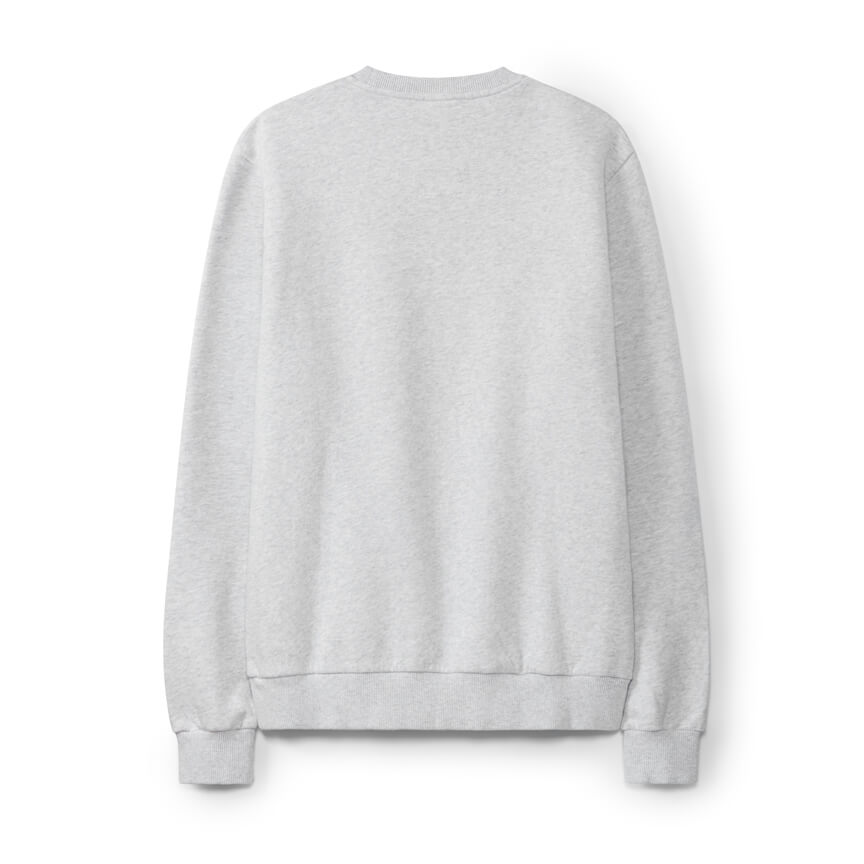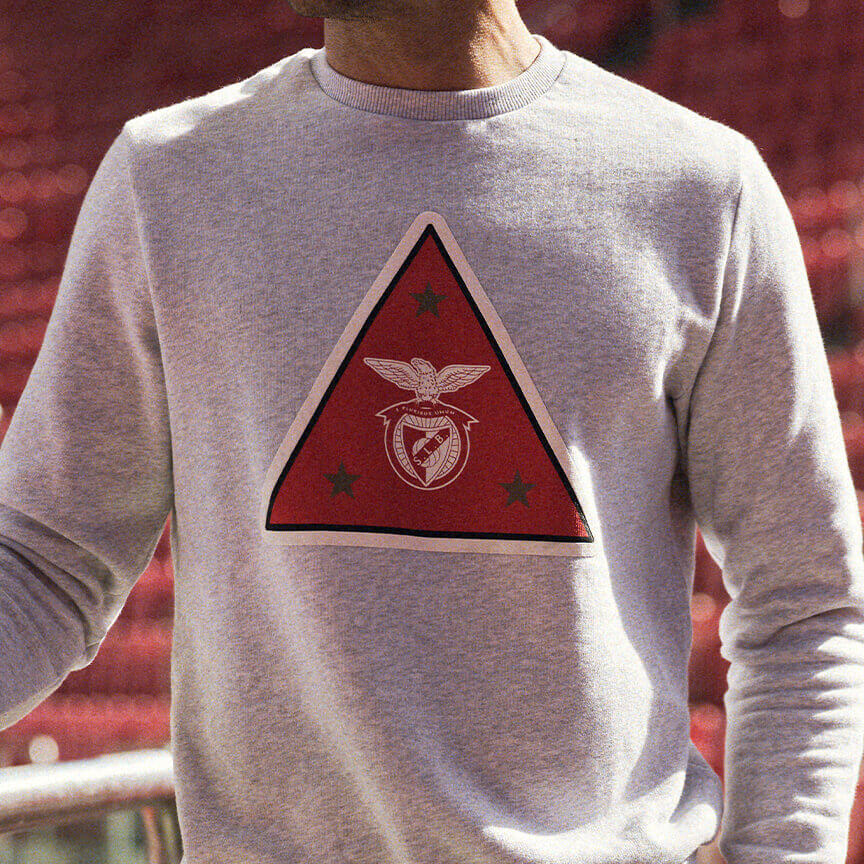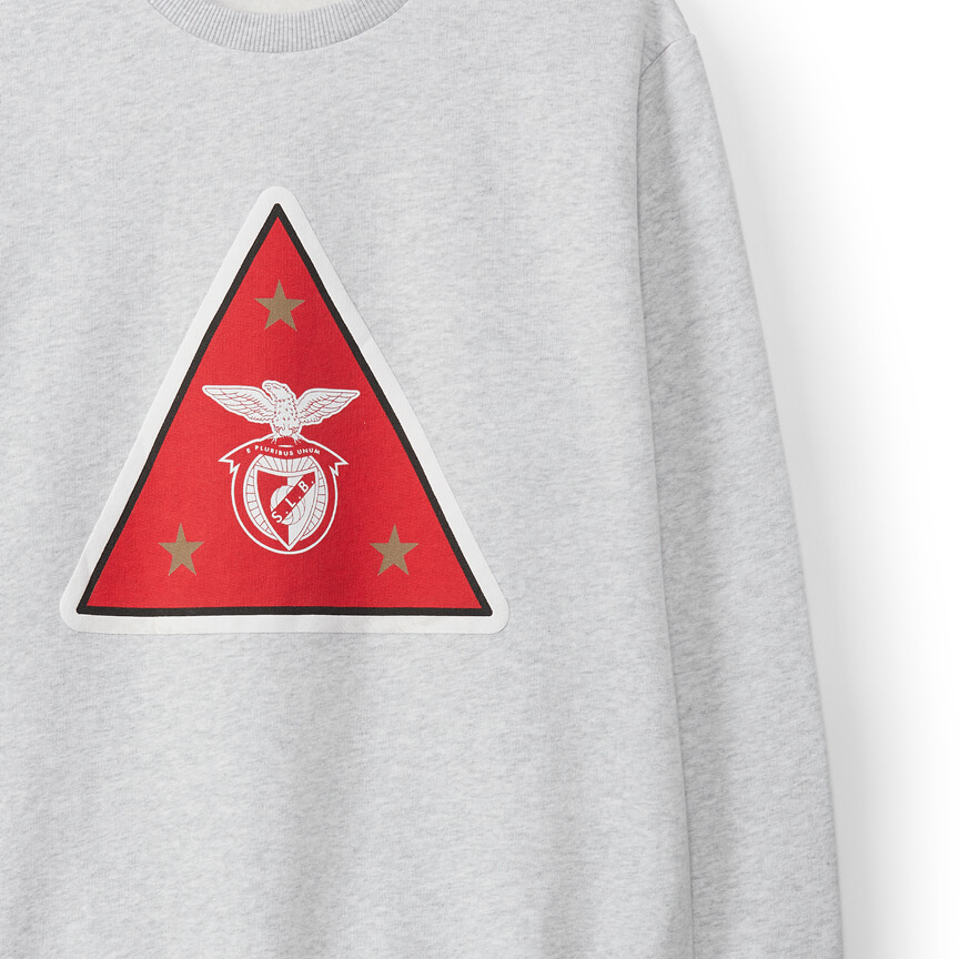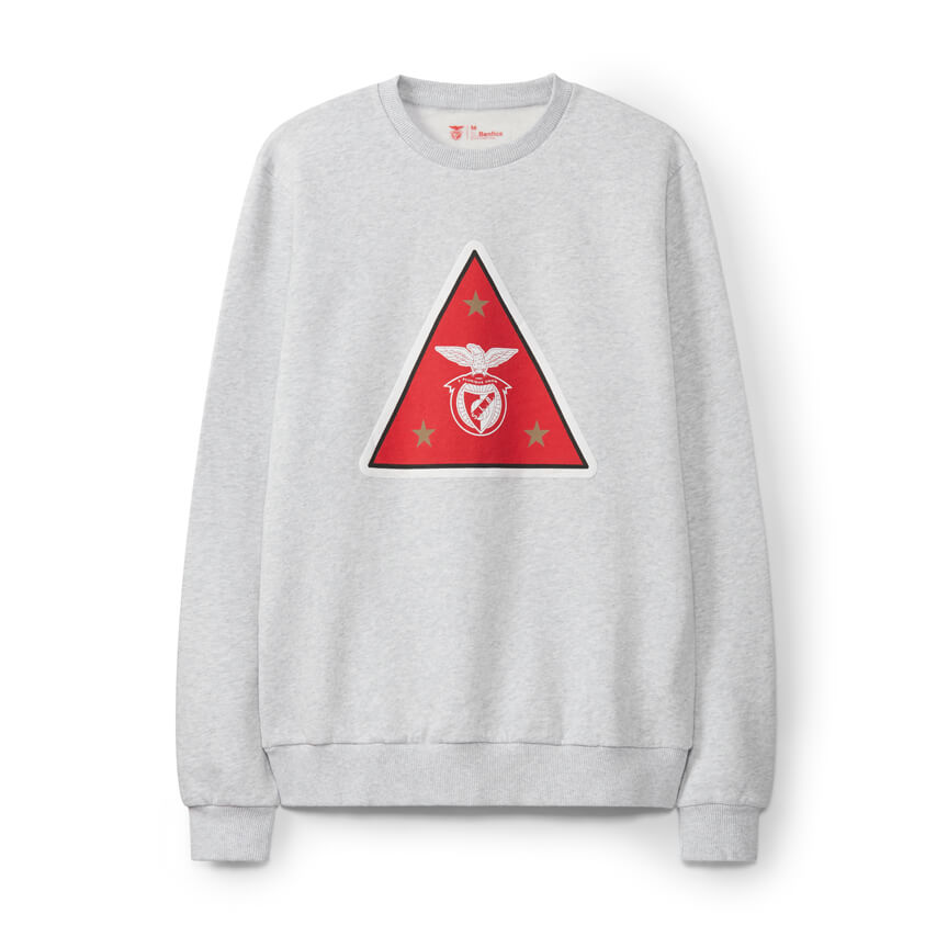 Sweat cinza cardada, modelo regular fit, com estampagem de um triângulo com a imagem do emblema monocromático branco do clube, sob um fundo vermelho.